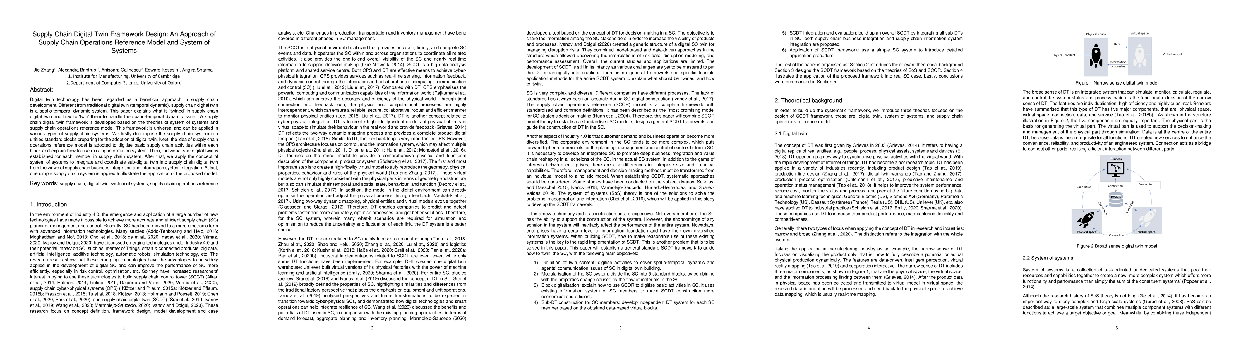 This paper develops a universal supply chain digital twin framework based on system of systems and supply chain operations reference model, decomposing supply chains into standard blocks and integrating individual sub-digital twins to handle spatio-temporal dynamics. The framework is demonstrated through a simple supply chain system.