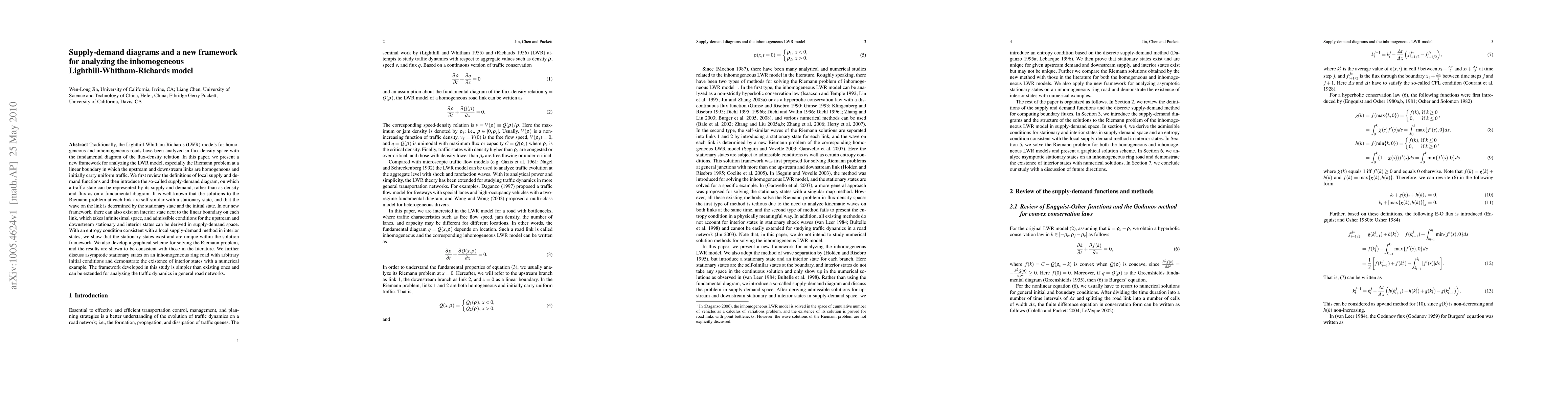 This paper introduces a new framework for analyzing the inhomogeneous Lighthill-Whitham-Richards (LWR) model using supply-demand diagrams, which represent traffic states by their supply and demand rather than density and flux. The authors develop a graphical scheme for solving the Riemann problem and show the existence of unique stationary states and interior states under entropy conditions.