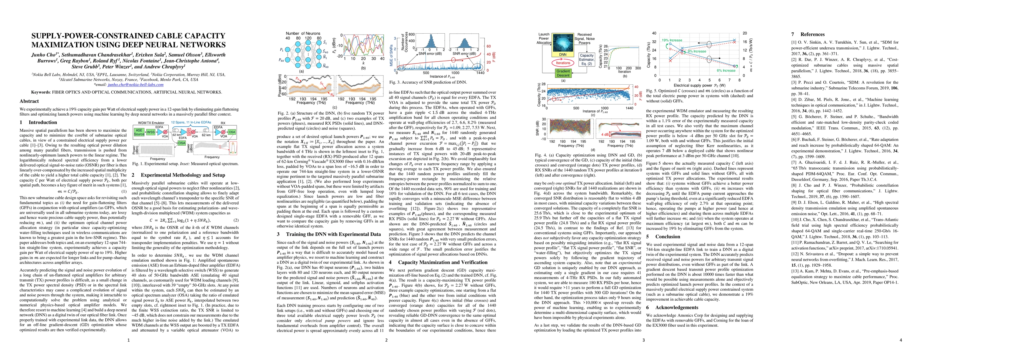 Summary: This study demonstrates a 19% capacity gain per Watt by leveraging deep neural networks to optimize launch powers and eliminate the need for gain flattening filters in a 12-span fiber link, achieving significant improvements in cable capacity under power constraints.