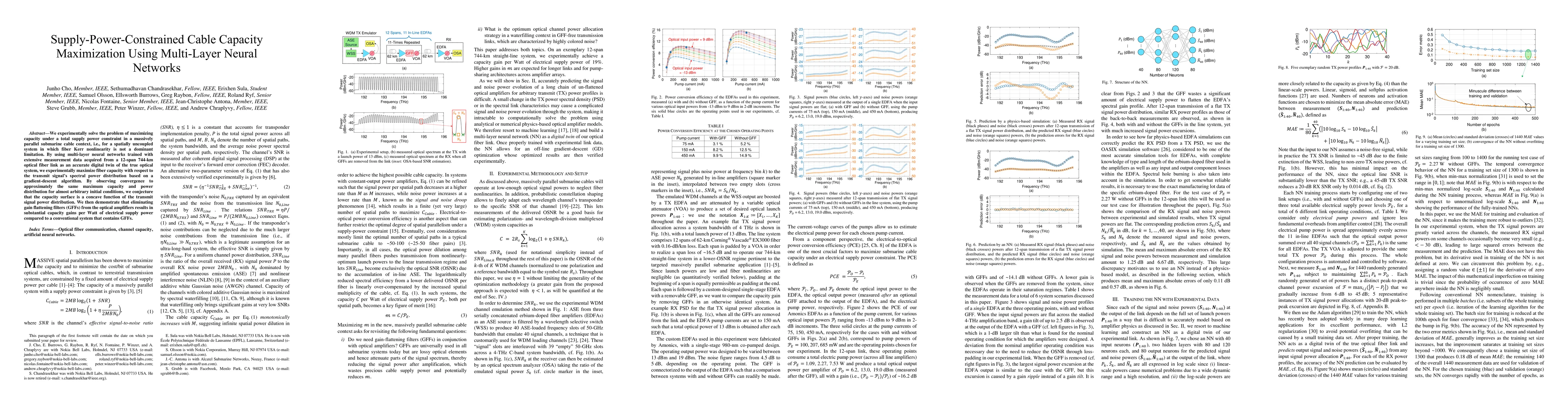 We experimentally solve the problem of maximizing capacity under a total supply power constraint in a massively parallel submarine cable context, i.e., for a spatially uncoupled system in which fiber Kerr nonlinearity is not a dominant limitation. By using multi-layer neural networks trained with extensive measurement data acquired from a 12-span 744-km optical fiber link as an accurate digital twin of the true optical system, we experimentally maximize fiber capacity with respect to the transmit signal's spectral power distribution based on a gradient-descent algorithm. By observing convergence to approximately the same maximum capacity and power distribution for almost arbitrary initial conditions, we conjecture that the capacity surface is a concave function of the transmit signal power distribution. We then demonstrate that eliminating gain flattening filters (GFFs) from the optical amplifiers results in substantial capacity gains per Watt of electrical supply power compared to a conventional system that contains GFFs.
