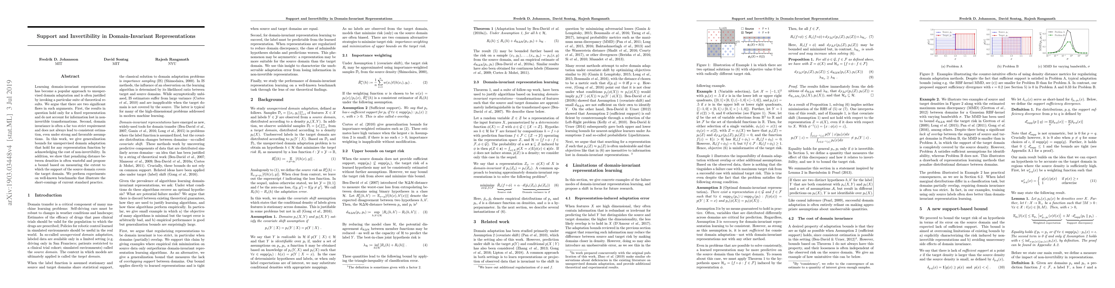 Learning domain-invariant representations has become a popular approach to unsupervised domain adaptation and is often justified by invoking a particular suite of theoretical results. We argue that there are two significant flaws in such arguments. First, the results in question hold only for a fixed representation and do not account for information lost in non-invertible transformations. Second, domain invariance is often a far too strict requirement and does not always lead to consistent estimation, even under strong and favorable assumptions. In this work, we give generalization bounds for unsupervised domain adaptation that hold for any representation function by acknowledging the cost of non-invertibility. In addition, we show that penalizing distance between densities is often wasteful and propose a bound based on measuring the extent to which the support of the source domain covers the target domain. We perform experiments on well-known benchmarks that illustrate the short-comings of current standard practice.