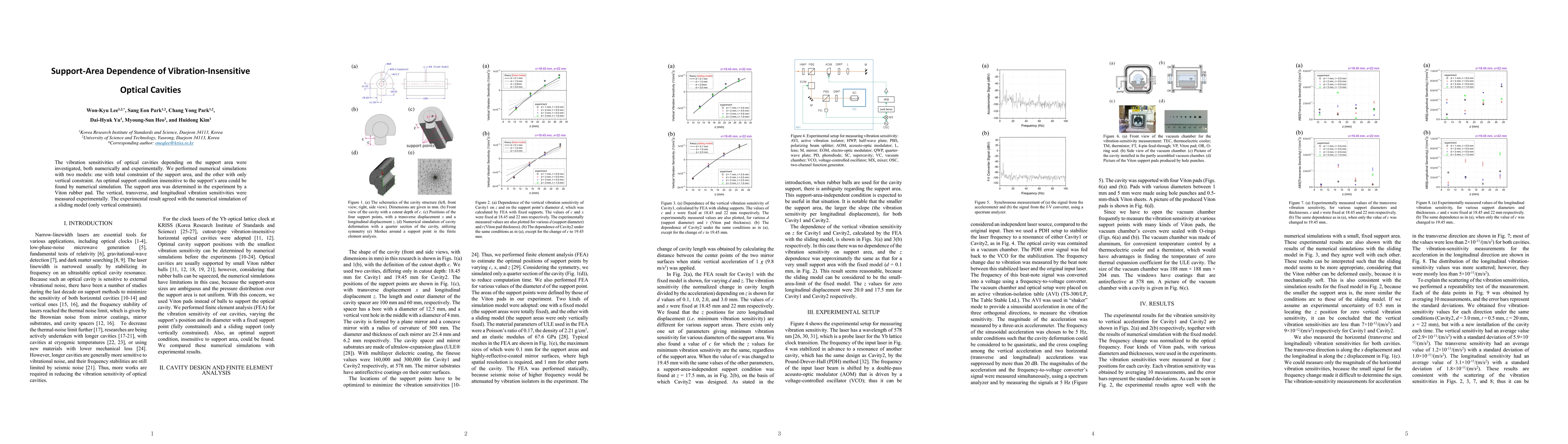 This paper investigates the vibration sensitivities of optical cavities based on their support area, using both numerical simulations and experimental validation. The study finds an optimal support condition that minimizes sensitivity to support-area size, confirmed through experiments using a Viton rubber pad and agreement between simulation and experimental results.