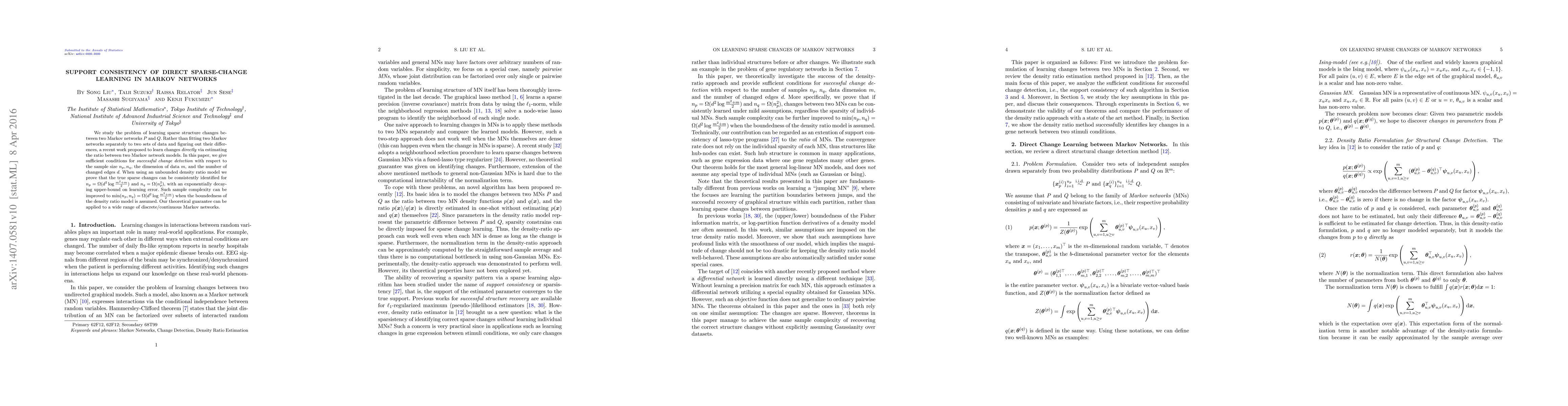 We study the problem of learning sparse structure changes between two Markov networks $P$ and $Q$. Rather than fitting two Markov networks separately to two sets of data and figuring out their differences, a recent work proposed to learn changes \emph{directly} via estimating the ratio between two Markov network models. In this paper, we give sufficient conditions for \emph{successful change detection} with respect to the sample size $n_p, n_q$, the dimension of data $m$, and the number of changed edges $d$. When using an unbounded density ratio model we prove that the true sparse changes can be consistently identified for $n_p = \Omega(d^2 \log \frac{m^2+m}{2})$ and $n_q = \Omega({n_p^2})$, with an exponentially decaying upper-bound on learning error. Such sample complexity can be improved to $\min(n_p, n_q) = \Omega(d^2 \log \frac{m^2+m}{2})$ when the boundedness of the density ratio model is assumed. Our theoretical guarantee can be applied to a wide range of discrete/continuous Markov networks.