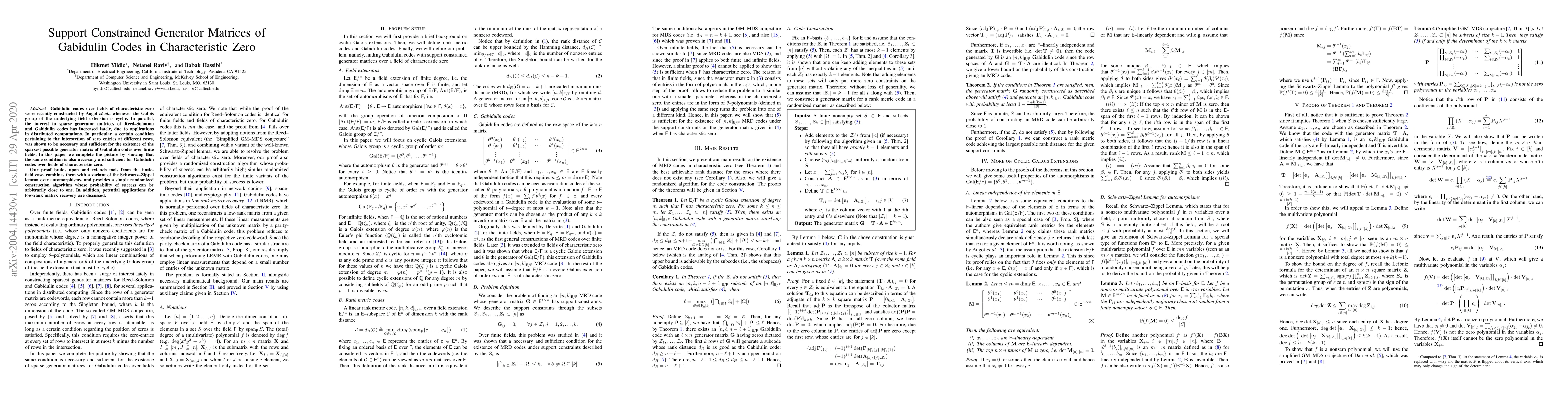 Gabidulin codes over fields of characteristic zero were recently constructed by Augot et al., whenever the Galois group of the underlying field extension is cyclic. In parallel, the interest in sparse generator matrices of Reed-Solomon and Gabidulin codes has increased lately, due to applications in distributed computations. In particular, a certain condition pertaining the intersection of zero entries at different rows, was shown to be necessary and sufficient for the existence of the sparsest possible generator matrix of Gabidulin codes over finite fields. In this paper we complete the picture by showing that the same condition is also necessary and sufficient for Gabidulin codes over fields of characteristic zero. Our proof builds upon and extends tools from the finite field case, combines them with a variant of the Schwartz-Zippel lemma over automorphisms, and provides a simple randomized construction algorithm whose probability of success can be arbitrarily close to one. In addition, potential applications for low-rank matrix recovery are discussed.