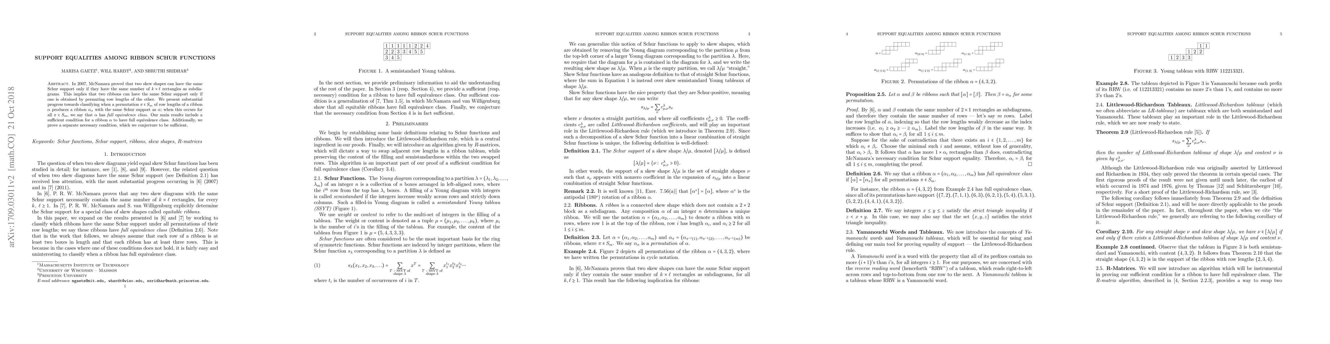 This paper advances the classification of ribbons with equal Schur supports by identifying conditions under which permuting row lengths of a ribbon $\alpha$ results in another ribbon $\alpha_{\pi}$ with the same Schur support. The authors provide a sufficient condition for a ribbon to have a "full equivalence class" and propose a necessary condition, which they conjecture to be sufficient.