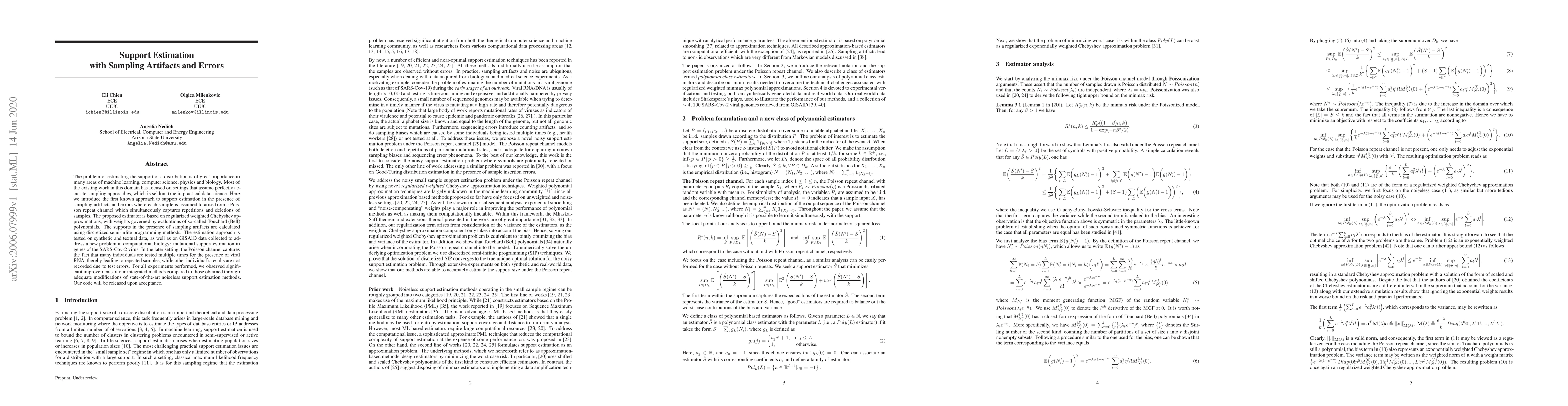The problem of estimating the support of a distribution is of great importance in many areas of machine learning, computer science, physics and biology. Most of the existing work in this domain has focused on settings that assume perfectly accurate sampling approaches, which is seldom true in practical data science. Here we introduce the first known approach to support estimation in the presence of sampling artifacts and errors where each sample is assumed to arise from a Poisson repeat channel which simultaneously captures repetitions and deletions of samples. The proposed estimator is based on regularized weighted Chebyshev approximations, with weights governed by evaluations of so-called Touchard (Bell) polynomials. The supports in the presence of sampling artifacts are calculated using discretized semi-infite programming methods. The estimation approach is tested on synthetic and textual data, as well as on GISAID data collected to address a new problem in computational biology: mutational support estimation in genes of the SARS-Cov-2 virus. In the later setting, the Poisson channel captures the fact that many individuals are tested multiple times for the presence of viral RNA, thereby leading to repeated samples, while other individual's results are not recorded due to test errors. For all experiments performed, we observed significant improvements of our integrated methods compared to those obtained through adequate modifications of state-of-the-art noiseless support estimation methods.