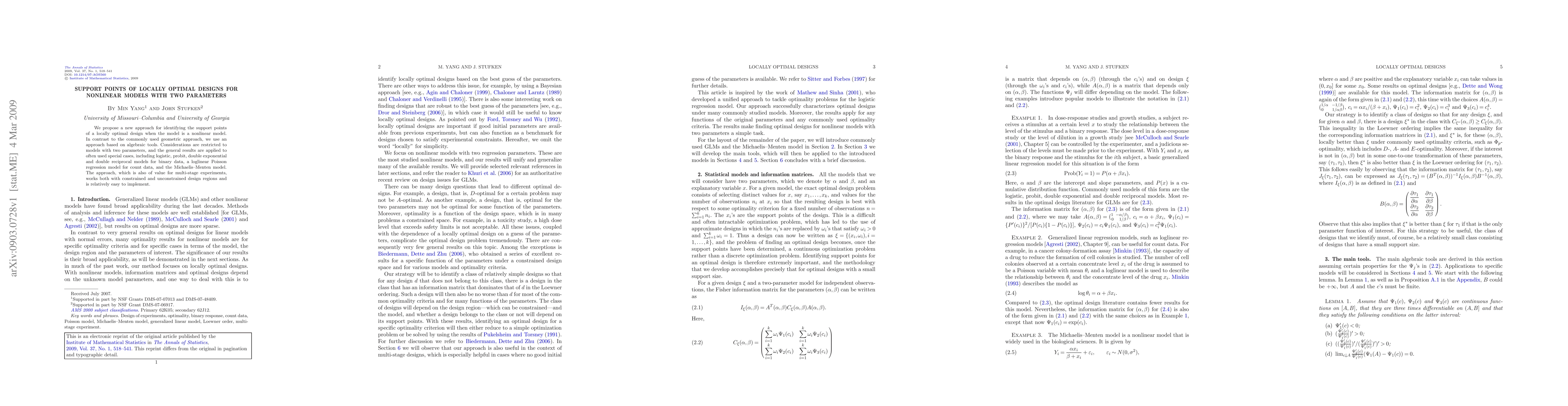 We propose a new approach for identifying the support points of a locally optimal design when the model is a nonlinear model. In contrast to the commonly used geometric approach, we use an approach based on algebraic tools. Considerations are restricted to models with two parameters, and the general results are applied to often used special cases, including logistic, probit, double exponential and double reciprocal models for binary data, a loglinear Poisson regression model for count data, and the Michaelis--Menten model. The approach, which is also of value for multi-stage experiments, works both with constrained and unconstrained design regions and is relatively easy to implement.