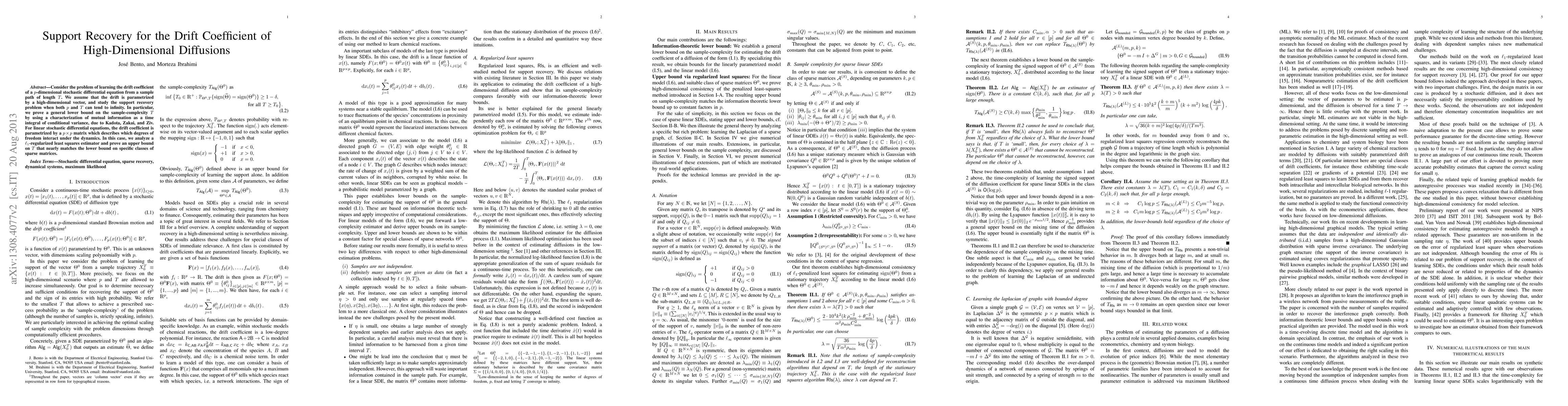 This paper investigates the support recovery of the drift coefficient in high-dimensional stochastic differential equations, proving a lower bound on sample complexity $T$ using mutual information. It also analyzes an $\ell_1$-regularized least squares estimator for linear SDEs, showing an upper bound on $T$ that nearly matches the lower bound for sparse matrices.