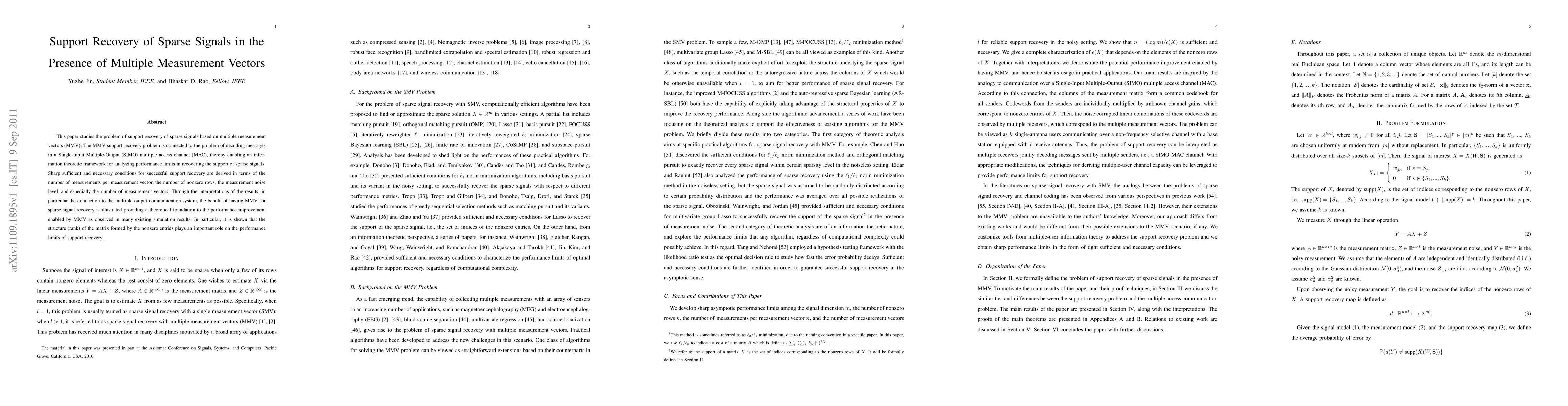 This paper derives sharp conditions for recovering the support of sparse signals using multiple measurement vectors (MMV), connecting the problem to decoding in a SIMO MAC. It demonstrates that MMV enhances recovery performance, especially as the matrix formed by the nonzero entries' rank increases.