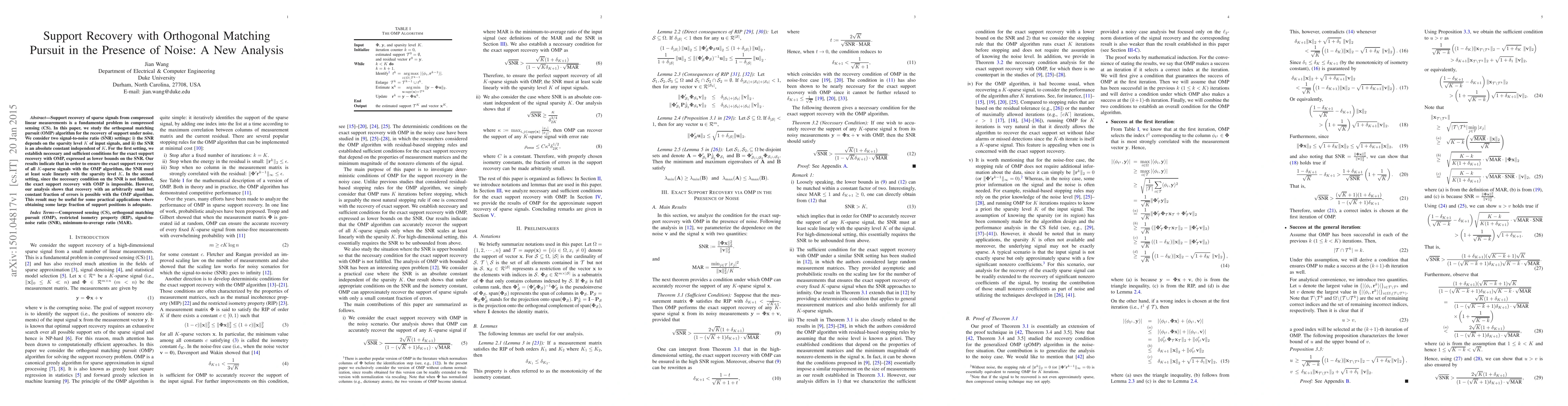 This paper analyzes the orthogonal matching pursuit (OMP) algorithm for sparse signal recovery under noise, establishing conditions for exact support recovery. It finds that for varying SNR dependent on sparsity level, exact recovery requires SNR scaling linearly with sparsity, while for constant SNR, exact recovery is impossible but partial recovery with small error is feasible.