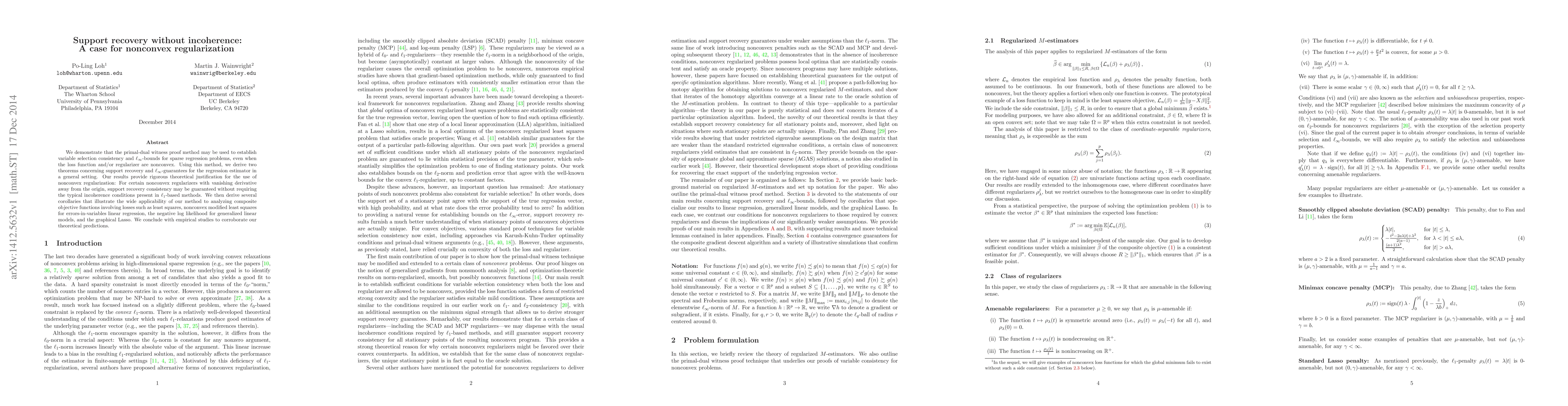 This paper uses a primal-dual witness proof method to establish variable selection consistency and $\ell_\infty$-bounds for sparse regression with nonconvex regularization, demonstrating support recovery without typical incoherence conditions. The method is shown to apply to various composite objective functions and is supported by empirical studies.