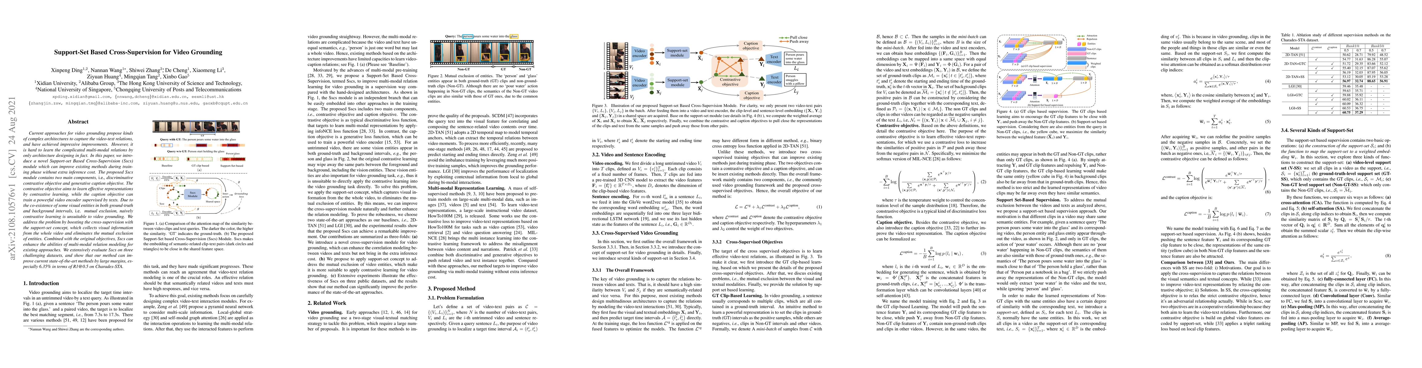 This paper introduces a Support-set Based Cross-Supervision (Sscs) module to enhance video grounding methods by improving multi-modal relation modeling. The Sscs module combines discriminative contrastive learning and generative caption objectives to effectively represent video-text relations, addressing the issue of mutual exclusion of visual entities.