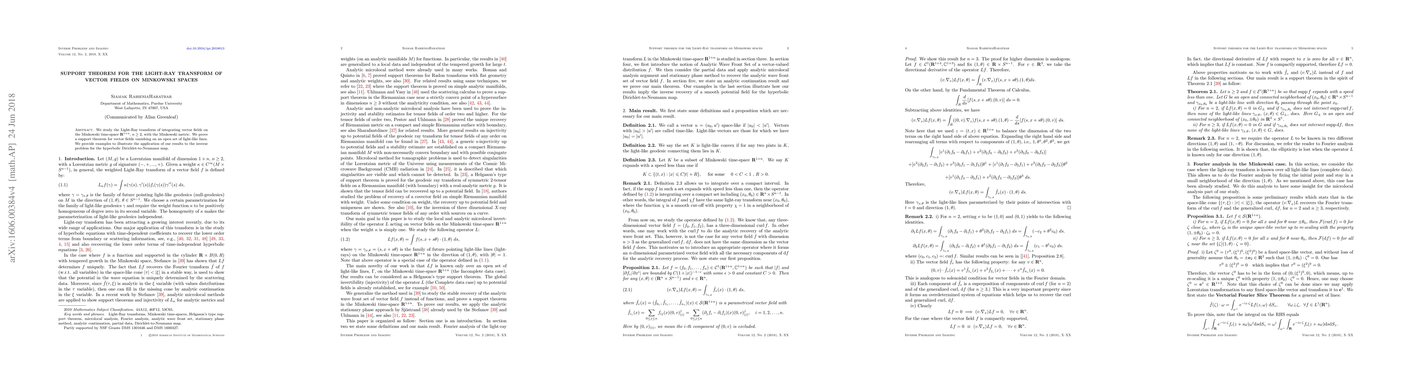 This paper proves a support theorem for the Light-Ray transform on Minkowski spaces, demonstrating that vector fields vanishing on an open set of light-like geodesics have a specific support characteristic. The study focuses on the Minkowski time-space R^{1+n} with n ≥ 2.
