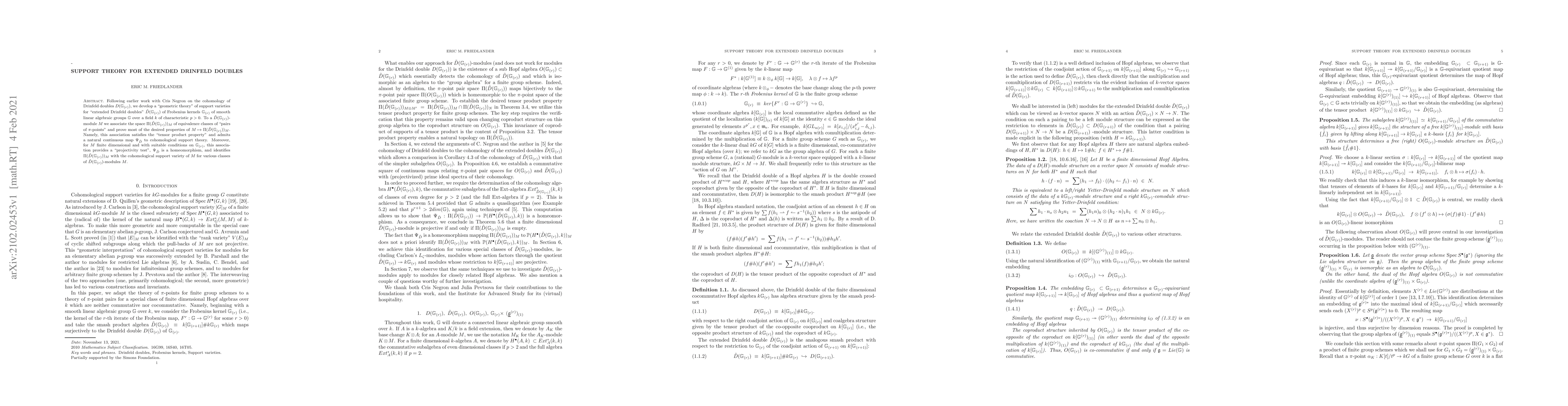 Following earlier work with Cris Negron on the cohomology of Drinfeld doubles $D(\mathbb G_{(r)})$, we develop a "geometric theory" of support varieties for "extended Drinfeld doubles" $\tilde D(\mathbb G_{(r)})$ of Frobenius kernels $\mathbb G_{(r)}$ of smooth linear algebraic groups $\mathbb G$ over a field $k$ of characteristic $p > 0$. To a $\tilde D(\mathbb G_{(r)})$-module $M$ we associate the space $\Pi(\tilde D(\mathbb G_{(r)}))_M$ of equivalence classes of "pairs of $\pi$-points" and prove most of the desired properties of $M \mapsto \Pi(\tilde D(\mathbb G_{(r)}))_M$. Namely, this association satisfies the "tensor product property" and admits a natural continuous map $\Psi_{\tilde D}$ to cohomological support theory. Moreover, for $M$ finite dimensional and with suitable conditions on $\mathbb G_{(r)}$, this association provides a "projectivity test", $\Psi_{\tilde D}$ is a homeomorphism, and identifies $\Pi(\tilde D(\mathbb G_{(r)}))_M$ with the cohomological support variety of $M$ for various classes of $\tilde D(\mathbb G_{(r)})$-modules $M$.