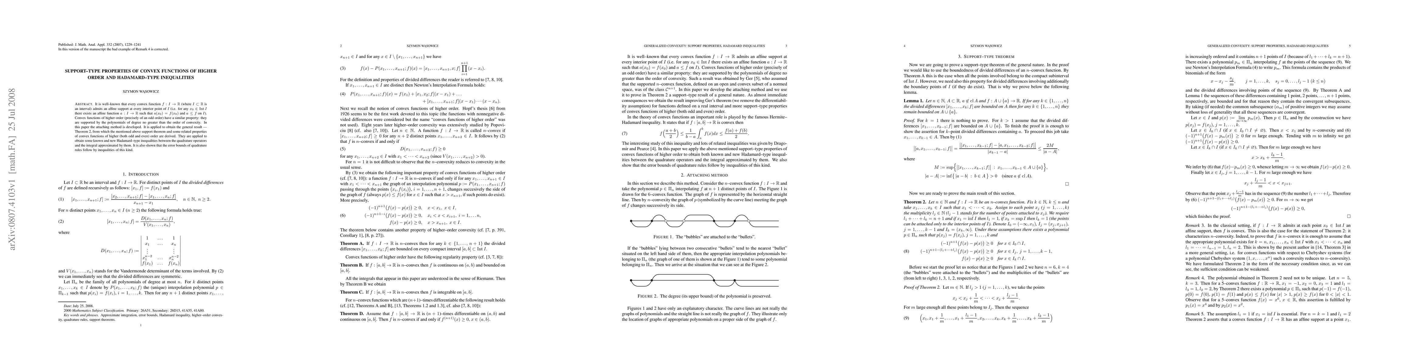 It is well-known that every convex function admits an affine support at every interior point of a domain. Convex functions of higher order (precisely of an odd order) have a similar property: they are supported by the polynomials of degree no greater than the order of convexity. In this paper the attaching method is developed. It is applied to obtain the general result Theorem 2, from which the mentioned above support theorem and some related properties of convex functions of higher (both odd and even) order are derived. They are applied to obtain some known and new Hadamard-type inequalities between the quadrature operators and the integral approximated by them. It is also shown that the error bounds of quadrature rules follow by inequalities of this kind.