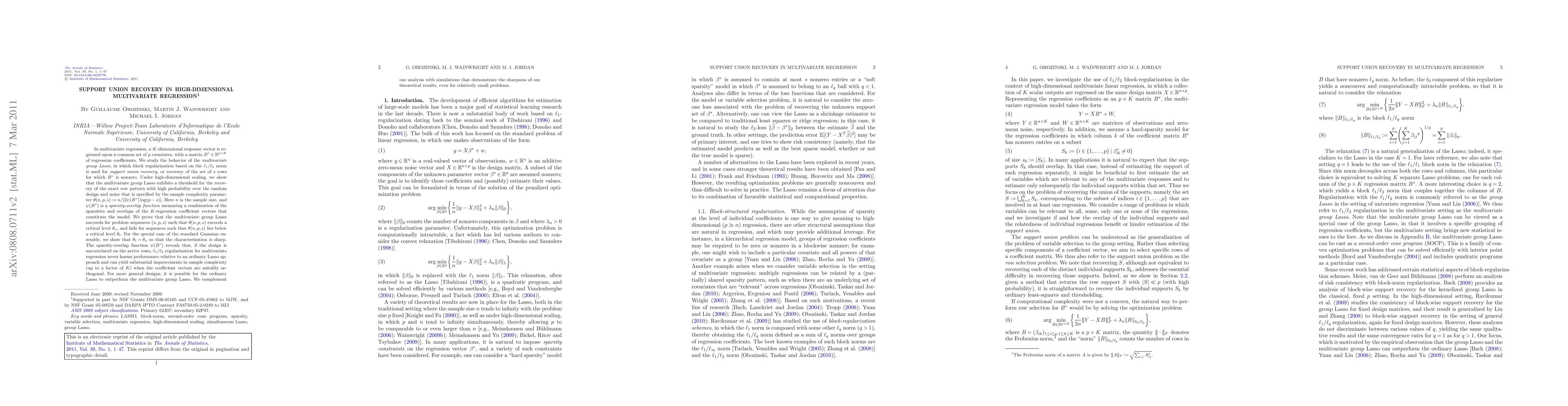 In multivariate regression, a $K$-dimensional response vector is regressed upon a common set of $p$ covariates, with a matrix $B^*\in\mathbb{R}^{p\times K}$ of regression coefficients. We study the behavior of the multivariate group Lasso, in which block regularization based on the $\ell_1/\ell_2$ norm is used for support union recovery, or recovery of the set of $s$ rows for which $B^*$ is nonzero. Under high-dimensional scaling, we show that the multivariate group Lasso exhibits a threshold for the recovery of the exact row pattern with high probability over the random design and noise that is specified by the sample complexity parameter $\theta(n,p,s):=n/[2\psi(B^*)\log(p-s)]$. Here $n$ is the sample size, and $\psi(B^*)$ is a sparsity-overlap function measuring a combination of the sparsities and overlaps of the $K$-regression coefficient vectors that constitute the model. We prove that the multivariate group Lasso succeeds for problem sequences $(n,p,s)$ such that $\theta(n,p,s)$ exceeds a critical level $\theta_u$, and fails for sequences such that $\theta(n,p,s)$ lies below a critical level $\theta_{\ell}$. For the special case of the standard Gaussian ensemble, we show that $\theta_{\ell}=\theta_u$ so that the characterization is sharp. The sparsity-overlap function $\psi(B^*)$ reveals that, if the design is uncorrelated on the active rows, $\ell_1/\ell_2$ regularization for multivariate regression never harms performance relative to an ordinary Lasso approach and can yield substantial improvements in sample complexity (up to a factor of $K$) when the coefficient vectors are suitably orthogonal. For more general designs, it is possible for the ordinary Lasso to outperform the multivariate group Lasso. We complement our analysis with simulations that demonstrate the sharpness of our theoretical results, even for relatively small problems.