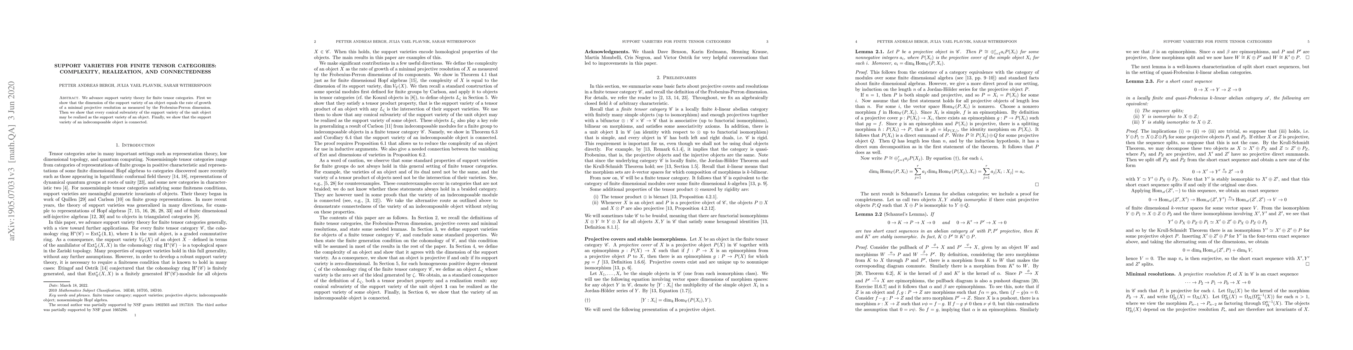This research paper advances support variety theory for finite tensor categories, showing that the dimension of the support variety equals a minimal projective resolution's growth rate and every conical subvariety can be realized as an object's support variety.