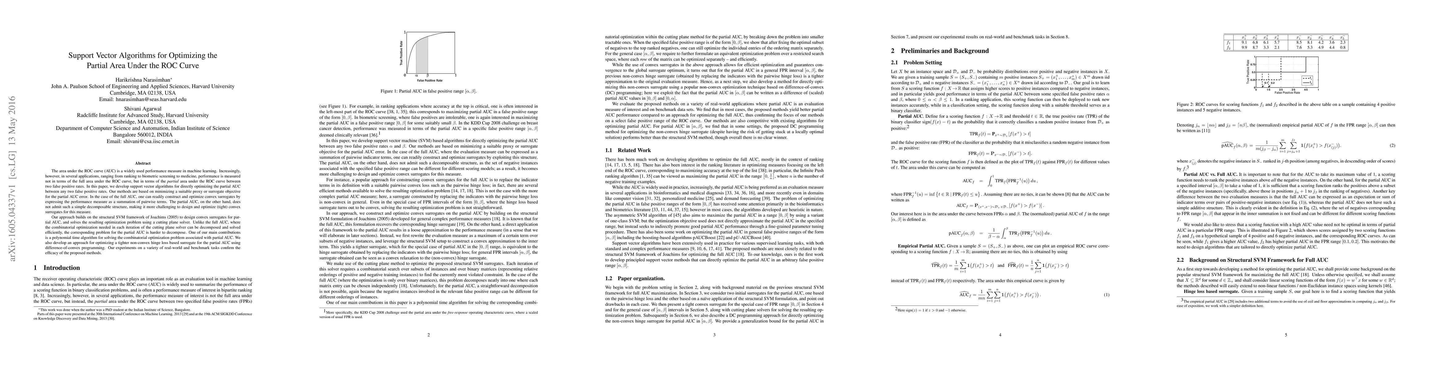 This paper develops support vector algorithms to optimize the partial area under the ROC curve (partial AUC) between specified false positive rates, addressing the challenge of designing convex surrogates for this measure. The authors propose a polynomial time algorithm for solving the associated combinatorial optimization problem and demonstrate the effectiveness of their methods through experiments on various tasks.
