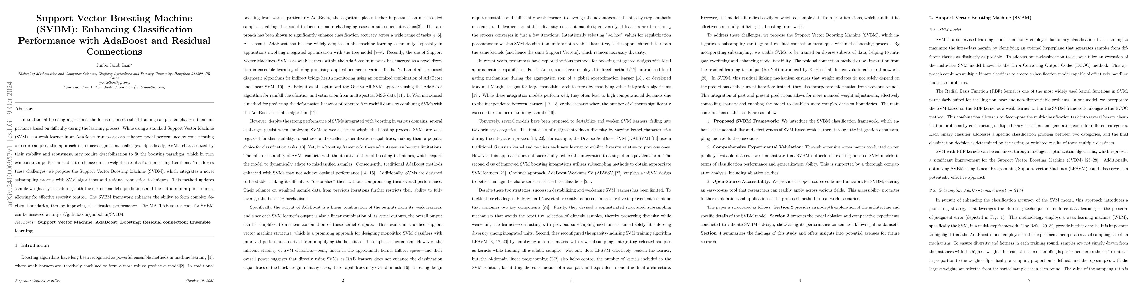 The paper introduces the Support Vector Boosting Machine (SVBM), a novel approach combining AdaBoost and residual connections to improve classification performance using SVMs. SVBM addresses challenges of traditional boosting by integrating subsampling and residual techniques for better sparsity control and complex decision boundary formation.