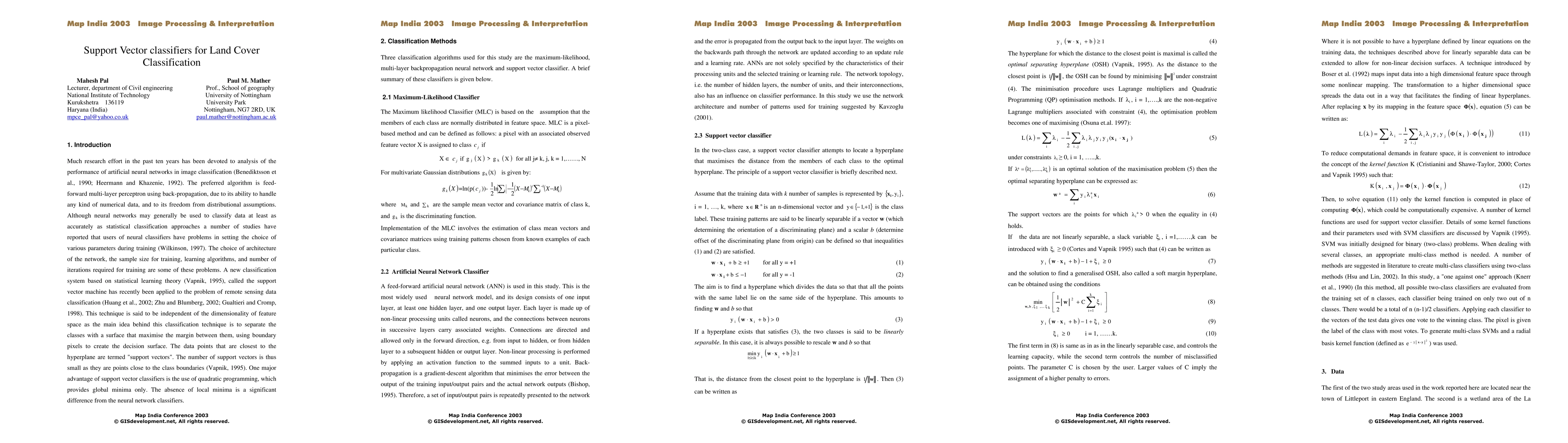This paper evaluates the performance of support vector machines (SVMs) for land cover classification using multispectral and hyperspectral data, finding that SVMs outperform maximum likelihood and neural network methods in terms of classification accuracy, especially with limited training datasets and high-dimensional data.