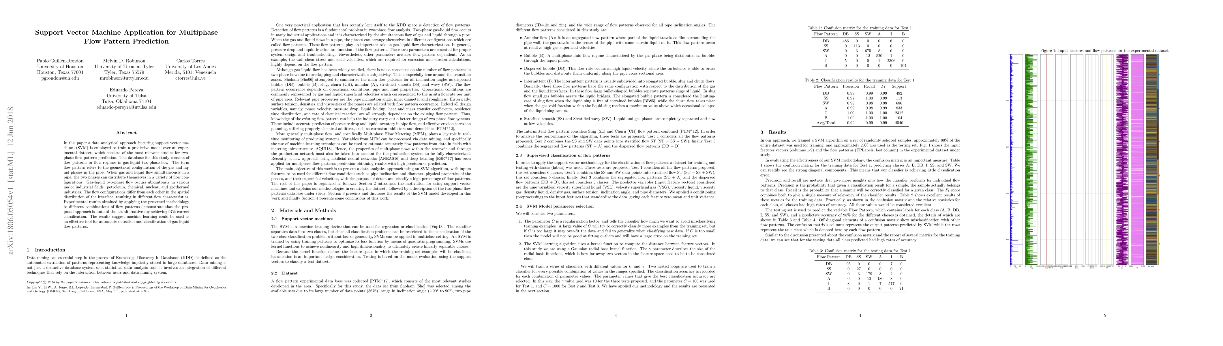 This paper utilizes support vector machines (SVM) to develop a predictive model for classifying gas-liquid two-phase flow patterns, achieving 97% accuracy. The findings suggest that machine learning techniques are effective for automatic detection and classification in industrial applications.