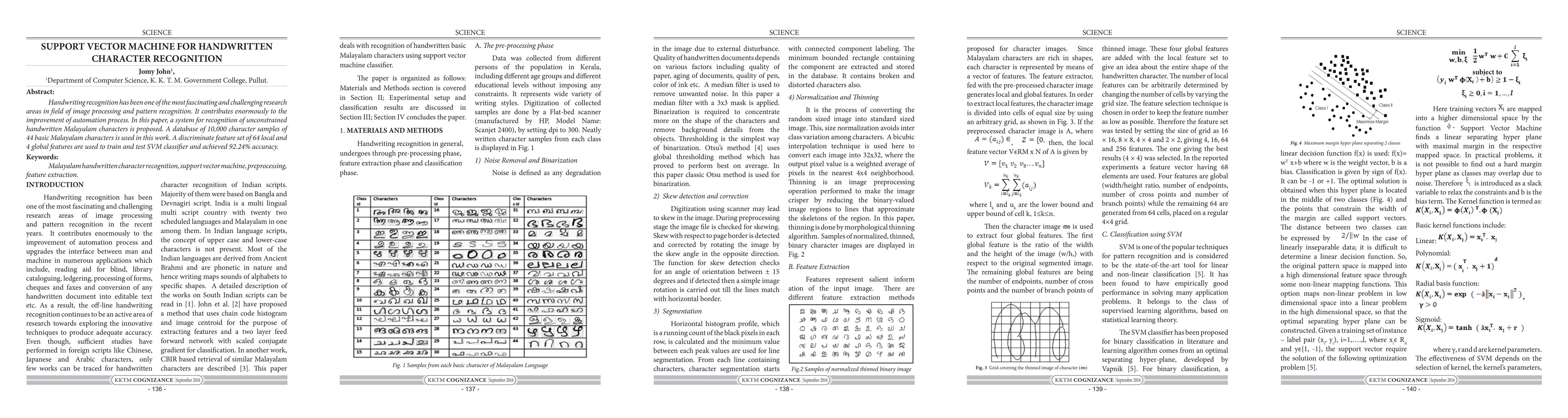 This paper proposes a Support Vector Machine (SVM) system for recognizing unconstrained handwritten Malayalam characters, achieving 92.24% accuracy using a database of 10,000 samples and a feature set combining 64 local and 4 global features.