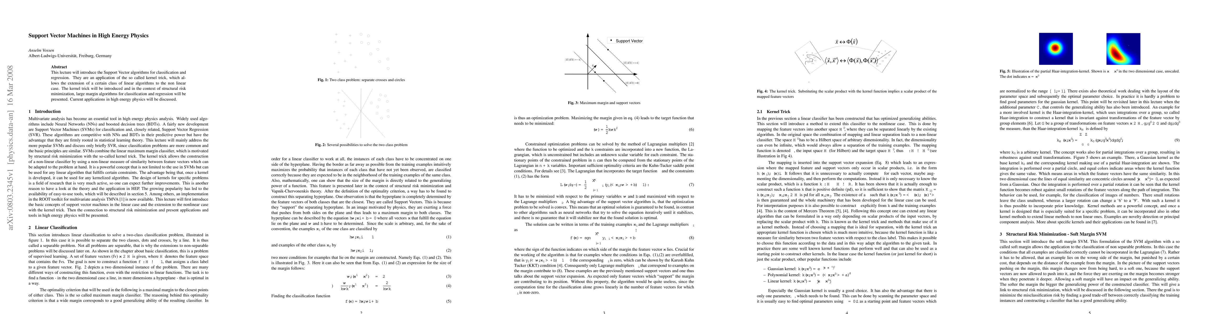 This lecture introduces Support Vector Machines for classification and regression in high energy physics, using a kernel trick to extend linear algorithms to non-linear cases. It discusses large margin algorithms for classification and regression, with current applications in the field.