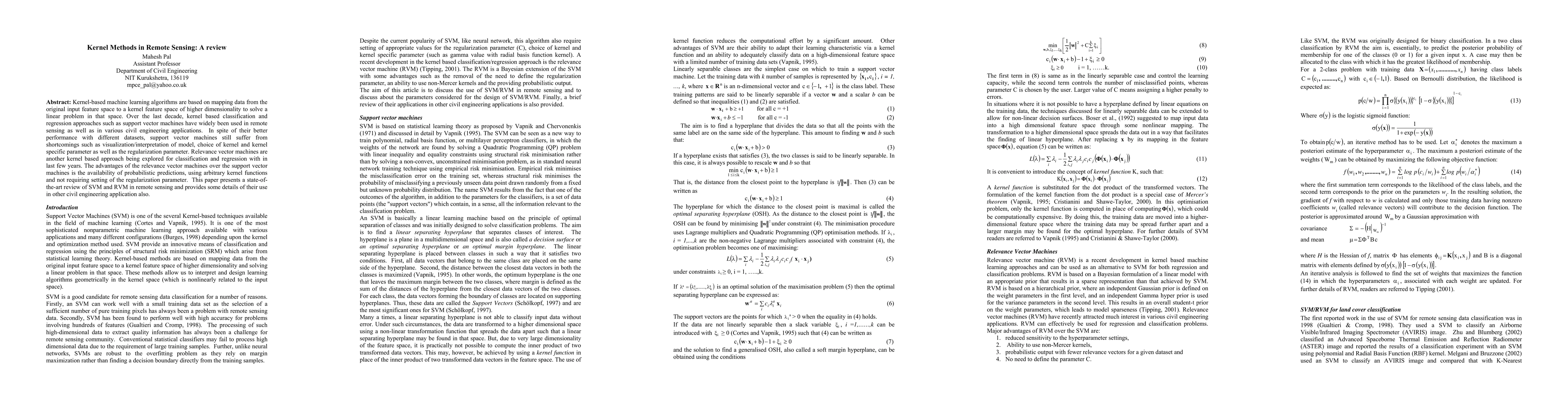 This paper reviews the use of kernel-based machine learning algorithms, specifically support vector machines (SVM) and relevance vector machines (RVM), in remote sensing and civil engineering. While SVMs offer strong performance, they face issues with model interpretation and parameter selection. RVMs provide probabilistic predictions and flexibility with kernel functions without needing regularization parameters.