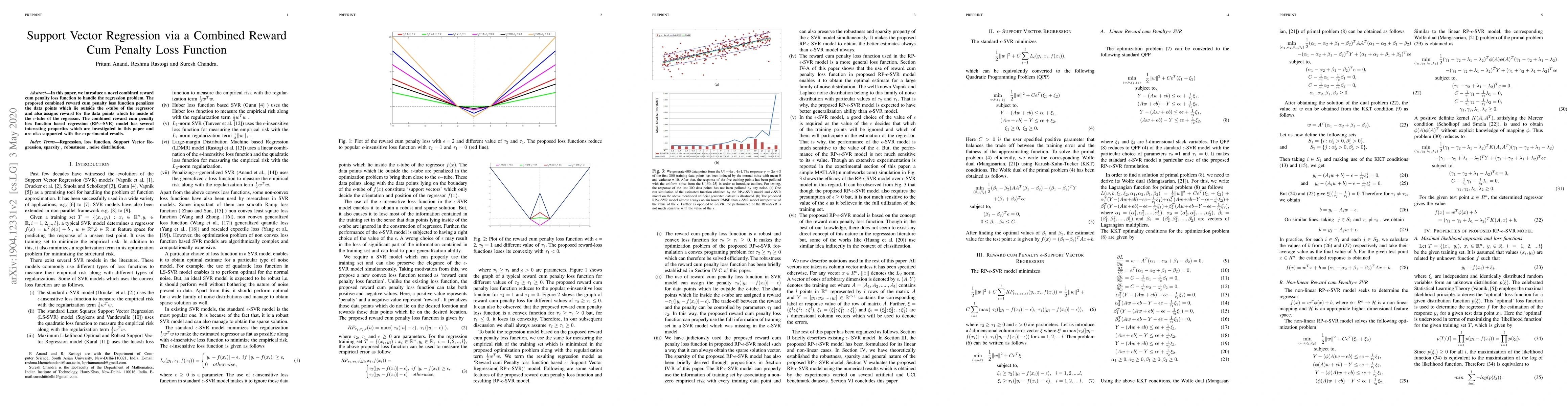 In this paper, we introduce a novel combined reward cum penalty loss function to handle the regression problem. The proposed combined reward cum penalty loss function penalizes the data points which lie outside the $\epsilon$-tube of the regressor and also assigns reward for the data points which lie inside of the $\epsilon$-tube of the regressor. The combined reward cum penalty loss function based regression (RP-$\epsilon$-SVR) model has several interesting properties which are investigated in this paper and are also supported with the experimental results.