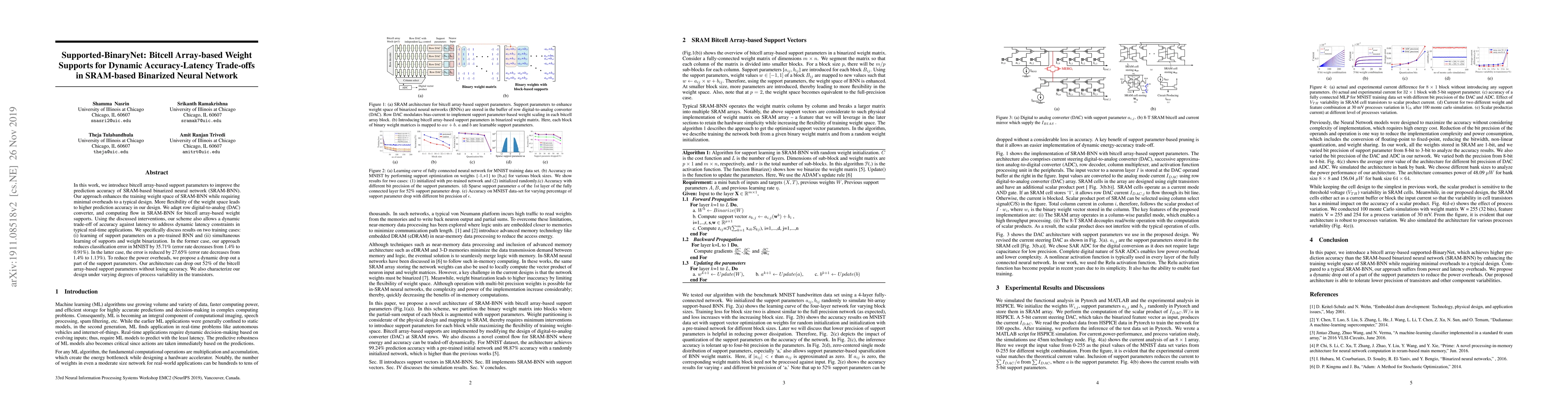 In this work, we introduce bitcell array-based support parameters to improve the prediction accuracy of SRAM-based binarized neural network (SRAM-BNN). Our approach enhances the training weight space of SRAM-BNN while requiring minimal overheads to a typical design. More flexibility of the weight space leads to higher prediction accuracy in our design. We adapt row digital-to-analog (DAC) converter, and computing flow in SRAM-BNN for bitcell array-based weight supports. Using the discussed interventions, our scheme also allows a dynamic trade-off of accuracy against latency to address dynamic latency constraints in typical real-time applications. We specifically discuss results on two training cases: (i) learning of support parameters on a pre-trained BNN and (ii) simultaneous learning of supports and weight binarization. In the former case, our approach reduces classification error in MNIST by 35.71% (error rate decreases from 1.4% to 0.91%). In the latter case, the error is reduced by 27.65% (error rate decreases from 1.4% to 1.13%). To reduce the power overheads, we propose a dynamic drop out a part of the support parameters. Our architecture can drop out 52% of the bitcell array-based support parameters without losing accuracy. We also characterize our design under varying degrees of process variability in the transistors.