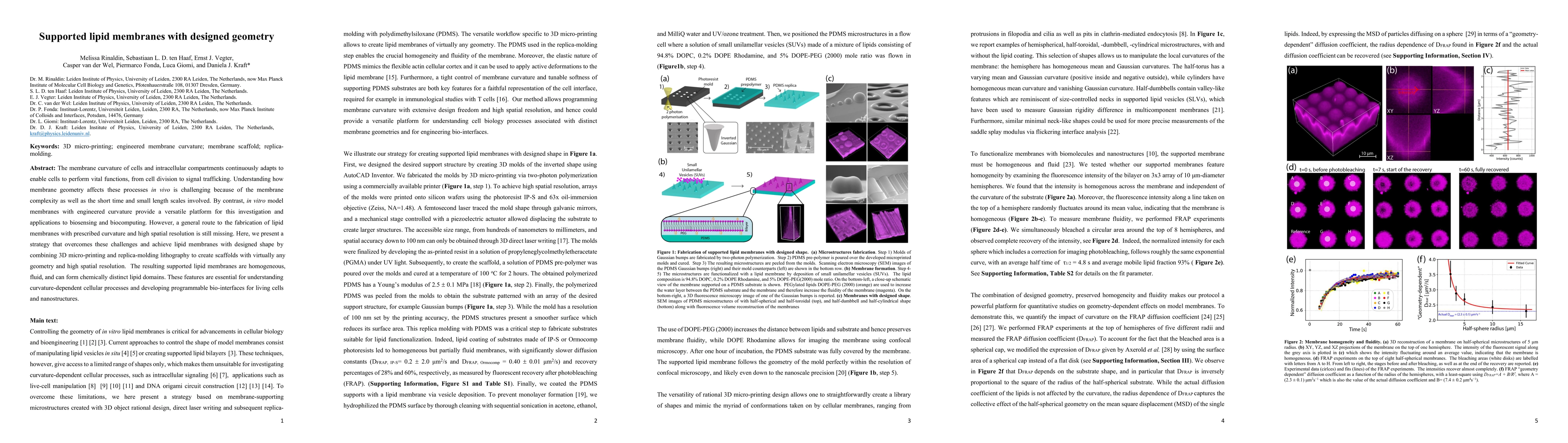 This paper presents a method combining 3D micro-printing and replica-molding lithography to fabricate supported lipid membranes with precise, designed geometry. The resulting membranes are homogeneous, fluid, and capable of forming distinct lipid domains, facilitating the study of curvature-dependent cellular processes and the development of programmable bio-interfaces.