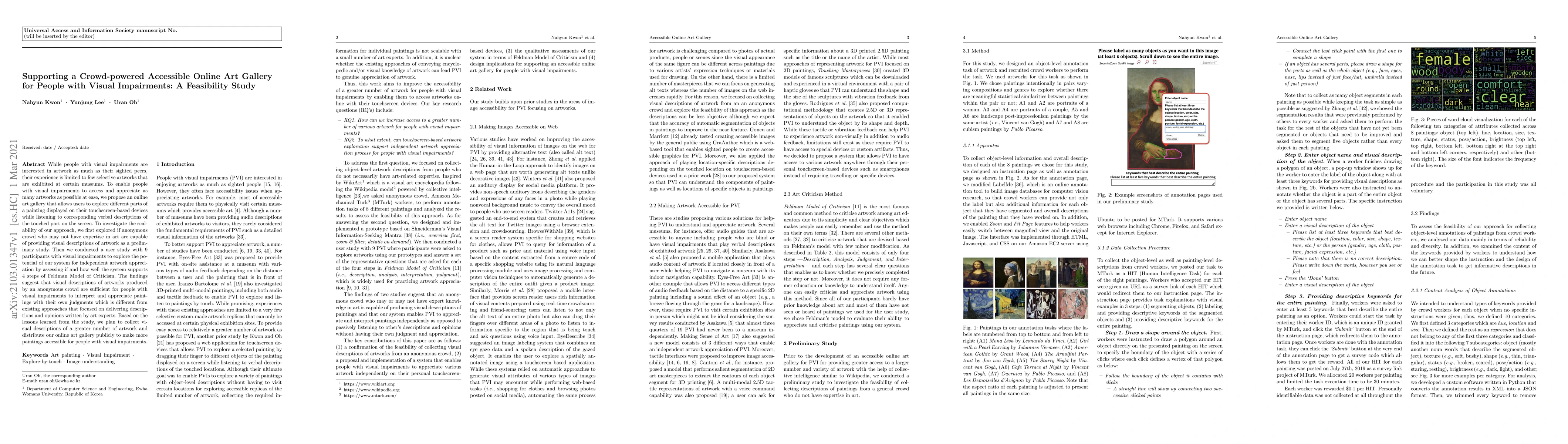 This study explores the feasibility of an online art gallery for people with visual impairments, enabling them to explore and appreciate artworks via verbal descriptions. Findings indicate that crowd-sourced visual descriptions are sufficient for independent interpretation, differing from expert-led approaches, and plans are underway to expand the gallery's accessibility.