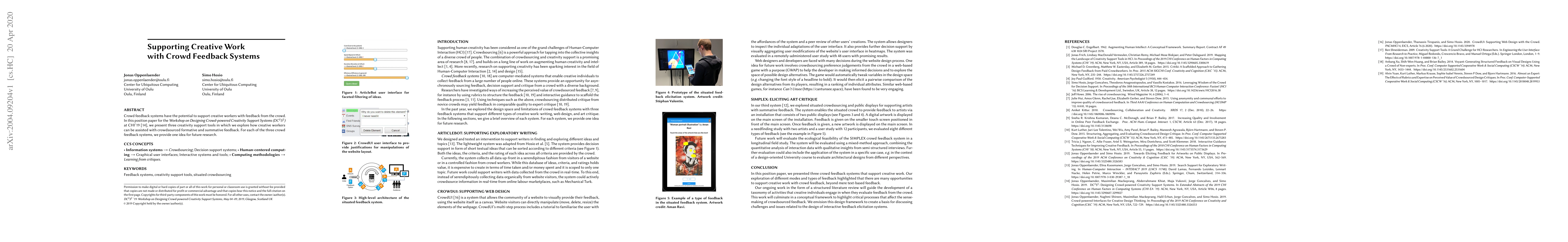 Crowd feedback systems have the potential to support creative workers with feedback from the crowd. In this position paper for the Workshop on Designing Crowd-powered Creativity Support Systems (DC2S2) at CHI '19, we present three creativity support tools in which we explore how creative workers can be assisted with crowdsourced formative and summative feedback. For each of the three crowd feedback systems, we provide one idea for future research.