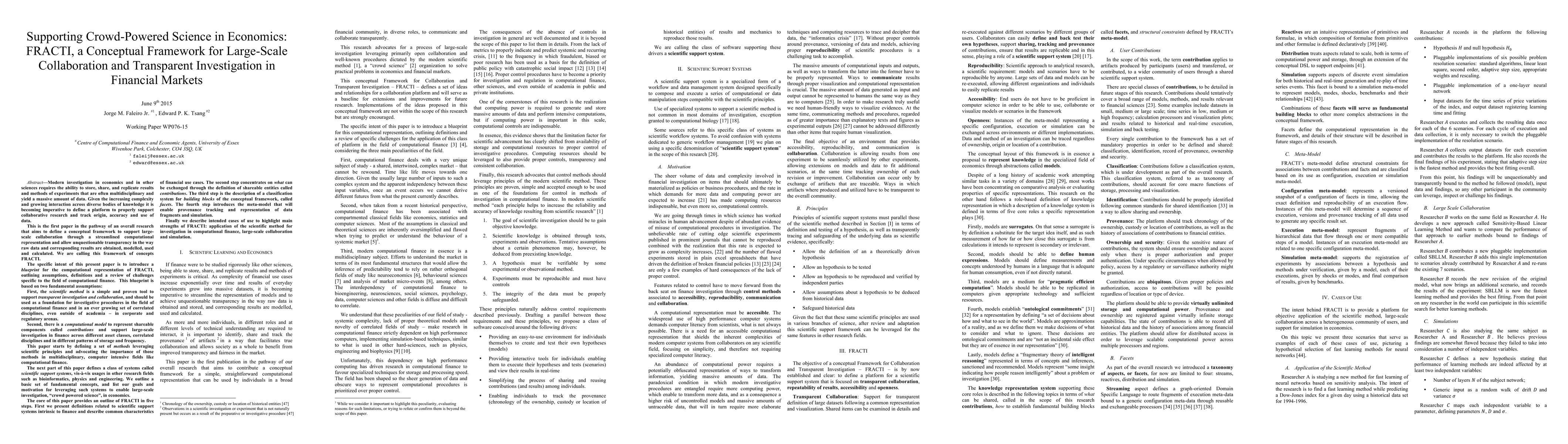 Modern investigation in economics and in other sciences requires the ability to store, share, and replicate results and methods of experiments that are often multidisciplinary and yield a massive amount of data. Given the increasing complexity and growing interaction across diverse bodies of knowledge it is becoming imperative to define a platform to properly support collaborative research and track origin, accuracy and use of data. This paper starts by defining a set of methods leveraging scientific principles and advocating the importance of those methods in multidisciplinary, computer intensive fields like computational finance. The next part of this paper defines a class of systems called scientific support systems, vis-a-vis usages in other research fields such as bioinformatics, physics and engineering. We outline a basic set of fundamental concepts, and list our goals and motivation for leveraging such systems to enable large-scale investigation, "crowd powered science", in economics. The core of this paper provides an outline of FRACTI in five steps. First we present definitions related to scientific support systems intrinsic to finance and describe common characteristics of financial use cases. The second step concentrates on what can be exchanged through the definition of shareable entities called contributions. The third step is the description of a classification system for building blocks of the conceptual framework, called facets. The fourth step introduces the meta-model that will enable provenance tracking and representation of data fragments and simulation. Finally we describe intended cases of use to highlight main strengths of FRACTI: application of the scientific method for investigation in computational finance, large-scale collaboration and simulation.