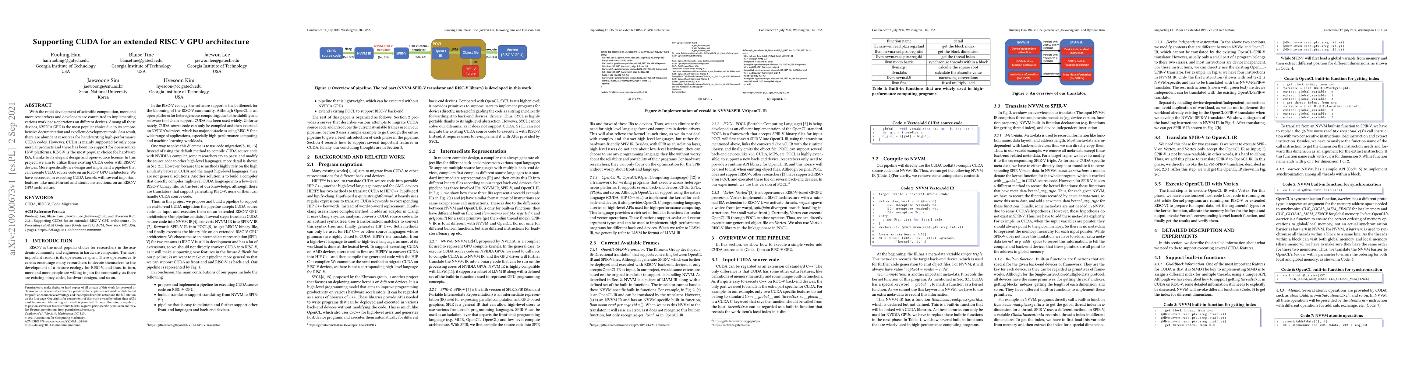 With the rapid development of scientific computation, more and more researchers and developers are committed to implementing various workloads/operations on different devices. Among all these devices, NVIDIA GPU is the most popular choice due to its comprehensive documentation and excellent development tools. As a result, there are abundant resources for hand-writing high-performance CUDA codes. However, CUDA is mainly supported by only commercial products and there has been no support for open-source H/W platforms. RISC-V is the most popular choice for hardware ISA, thanks to its elegant design and open-source license. In this project, we aim to utilize these existing CUDA codes with RISC-V devices. More specifically, we design and implement a pipeline that can execute CUDA source code on an RISC-V GPU architecture. We have succeeded in executing CUDA kernels with several important features, like multi-thread and atomic instructions, on an RISC-V GPU architecture.