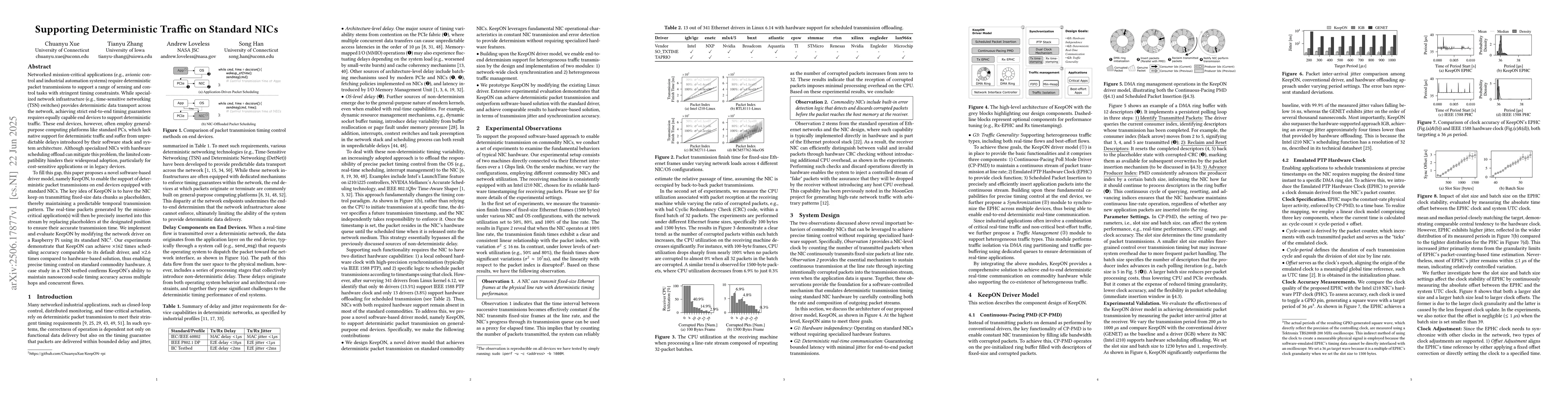 Networked mission-critical applications (e.g., avionic control and industrial automation systems) require deterministic packet transmissions to support a range of sensing and control tasks with stringent timing constraints. While specialized network infrastructure (e.g., time-sensitive networking (TSN) switches) provides deterministic data transport across the network, achieving strict end-to-end timing guarantees requires equally capable end devices to support deterministic traffic. These end devices, however, often employ general-purpose computing platforms like standard PCs, which lack native support for deterministic traffic and suffer from unpredictable delays introduced by their software stack and system architecture. Although specialized NICs with hardware scheduling offload can mitigate this problem, the limited compatibility hinders their widespread adoption, particularly for cost-sensitive applications or in legacy devices. To fill this gap, this paper proposes a novel software-based driver model, namely KeepON, to enable the support of deterministic packet transmissions on end devices equipped with standard NICs. The key idea of KeepON is to have the NIC keep on transmitting fixed-size data chunks as placeholders, thereby maintaining a predictable temporal transmission pattern. The real-time packets generated by the mission-critical application(s) will then be precisely inserted into this stream by replacing placeholders at the designated position to ensure their accurate transmission time. We implement and evaluate KeepON by modifying the network driver on a Raspberry Pi using its standard NIC. Our experiments demonstrate that KeepON can achieve x162 times scheduling accuracy comparable to its default driver, and x2.6 times compared to hardware-based solution, thus enabling precise timing control on standard commodity hardware.
