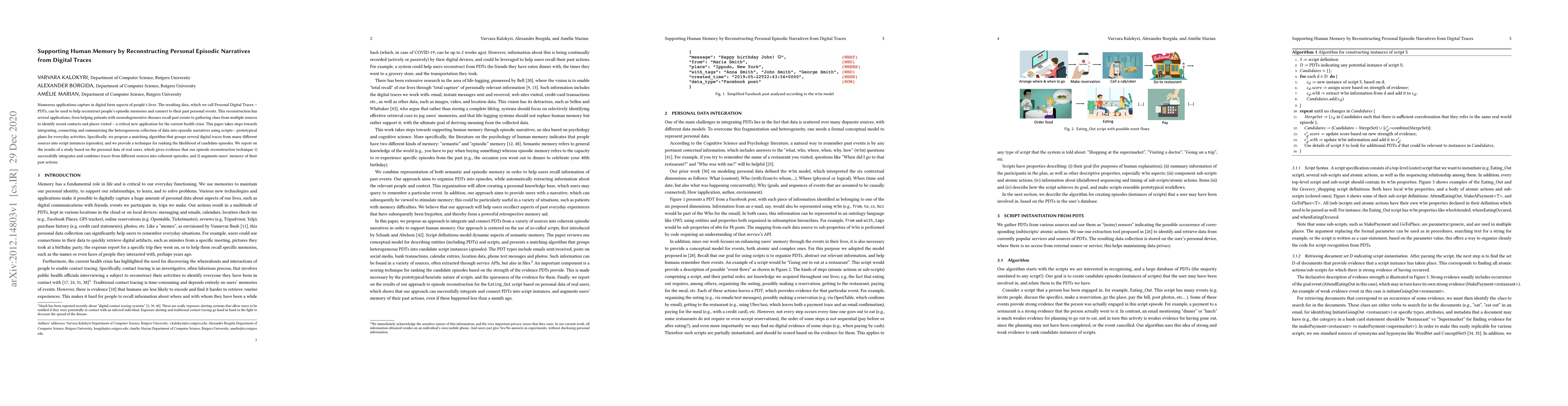 This paper proposes a method to reconstruct personal episodic narratives from Personal Digital Traces (PDTs) to aid memory recall, particularly for patients with neurodegenerative diseases. The technique uses a matching algorithm to group digital traces into coherent episodes and ranks their likelihood, demonstrating successful integration and memory enhancement in real user data.