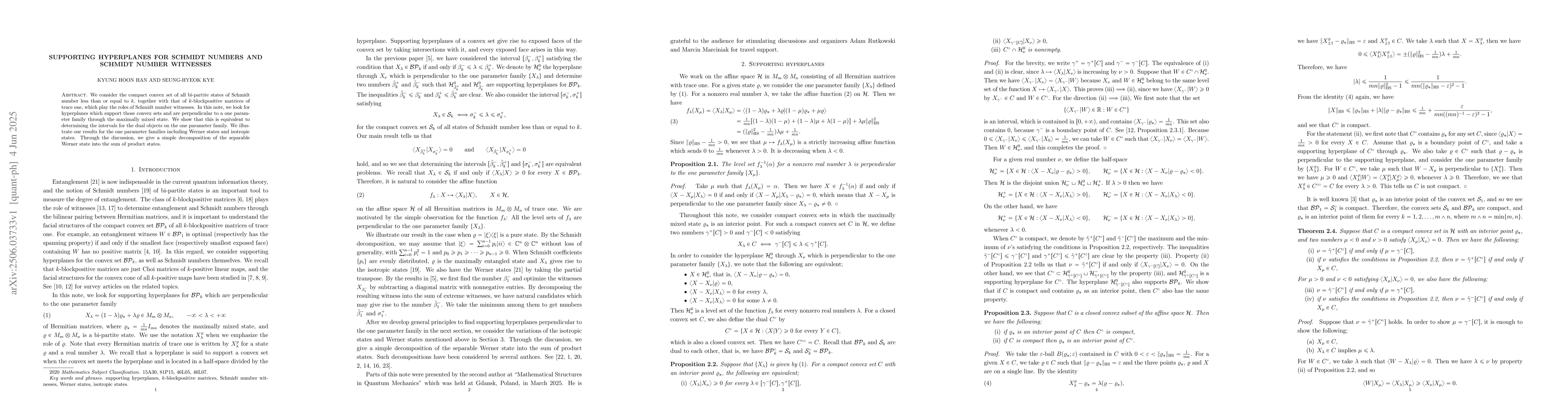 We consider the compact convex set of all bi-partite states of Schmidt number less than or equal to $k$, together with that of $k$-blockpositive matrices of trace one, which play the roles of Schmidt number witnesses. In this note, we look for hyperplanes which support those convex sets and are perpendicular to a one parameter family through the maximally mixed state. We show that this is equivalent to determining the intervals for the dual objects on the one parameter family. We illustrate our results for the one parameter families including Werner states and isotropic states. Through the discussion, we give a simple decomposition of the separable Werner state into the sum of product states.