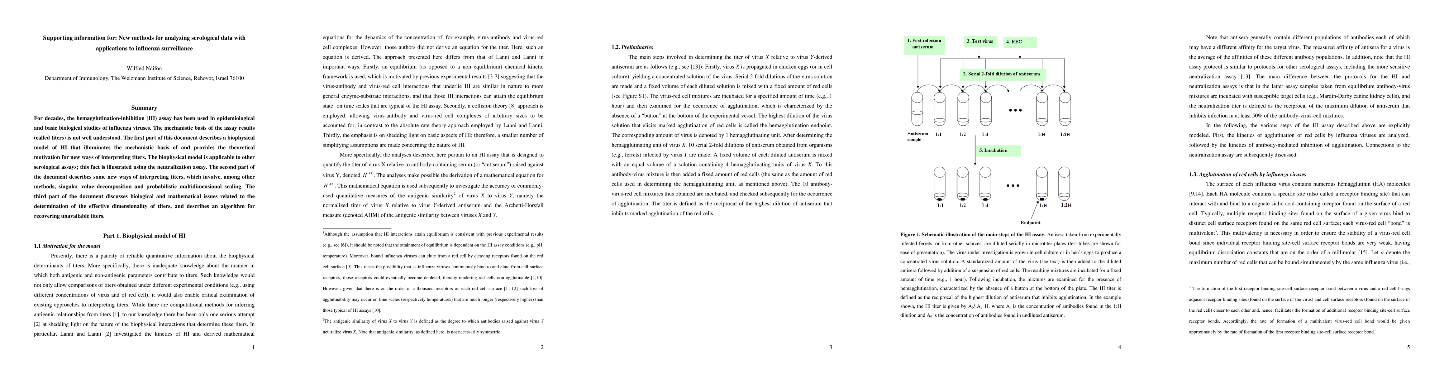 For decades, the hemagglutination-inhibition (HI) assay has been used in epidemiological and basic biological studies of influenza viruses. The mechanistic basis of the assay results (called titers) is not well understood. The first part of this document describes a biophysical model of HI that illuminates the mechanistic basis of and provides the theoretical motivation for new ways of interpreting titers. The biophysical model is applicable to other serological assays; this fact is illustrated using the neutralization assay. The second part of the document describes some new ways of interpreting titers, which involve, among other methods, singular value decomposition and probabilistic multidimensional scaling. The third part of the document discusses biological and mathematical issues related to the determination of the effective dimensionality of titers, and describes an algorithm for recovering unavailable titers.