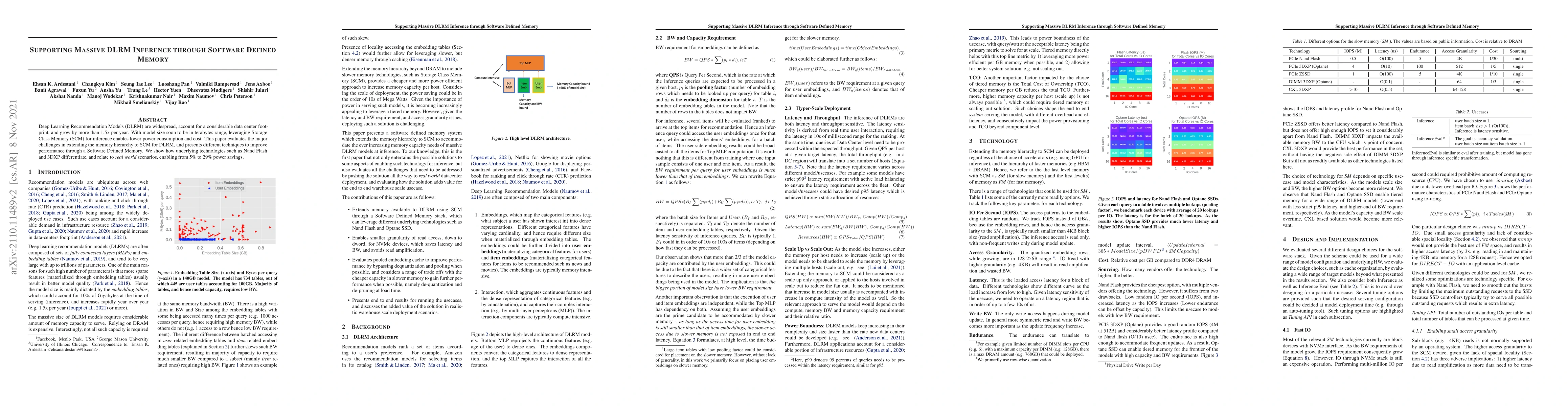 This paper investigates the challenges of scaling Deep Learning Recommendation Models (DLRM) using Storage Class Memory (SCM) for inference, proposing techniques to enhance performance via Software Defined Memory. It demonstrates that leveraging SCM technologies like Nand Flash and 3DXP can achieve power savings ranging from 5% to 29%.