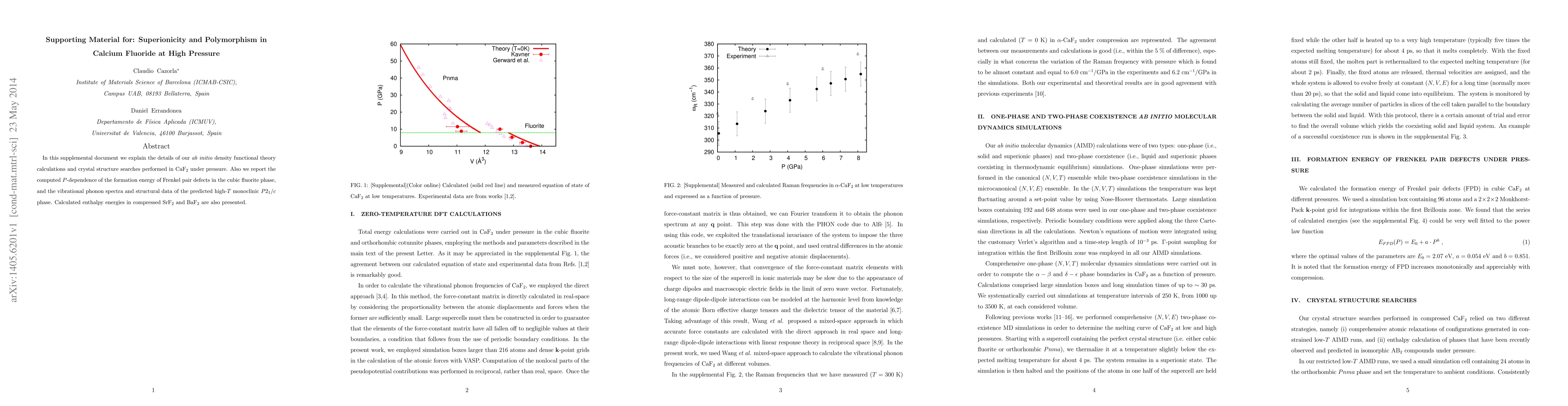 In this supplemental document we explain the details of our ab initio density functional theory calculations and crystal structure searches performed in CaF2 under pressure. Also we report the computed P-dependence of the formation energy of Frenkel pair defects in the cubic fluorite phase, and the vibrational phonon spectra and structural data of the predicted high-T monoclinic P2_1/c phase. Calculated enthalpy energies in compressed SrF2 and BaF2 are also presented.