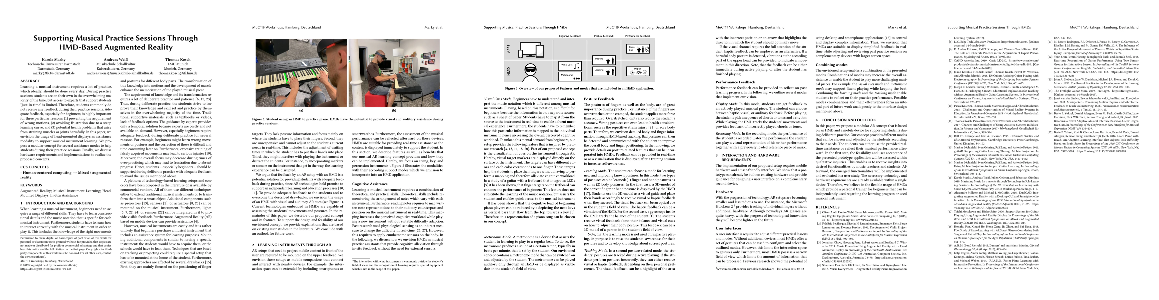 The paper proposes using head-mounted displays (HMDs) to provide real-time assistance during musical instrument practice sessions, addressing the lack of expert feedback. It outlines a modular concept for various assistance modes to aid students, focusing on preventing incorrect motions, reducing frustration, and avoiding potential health issues.