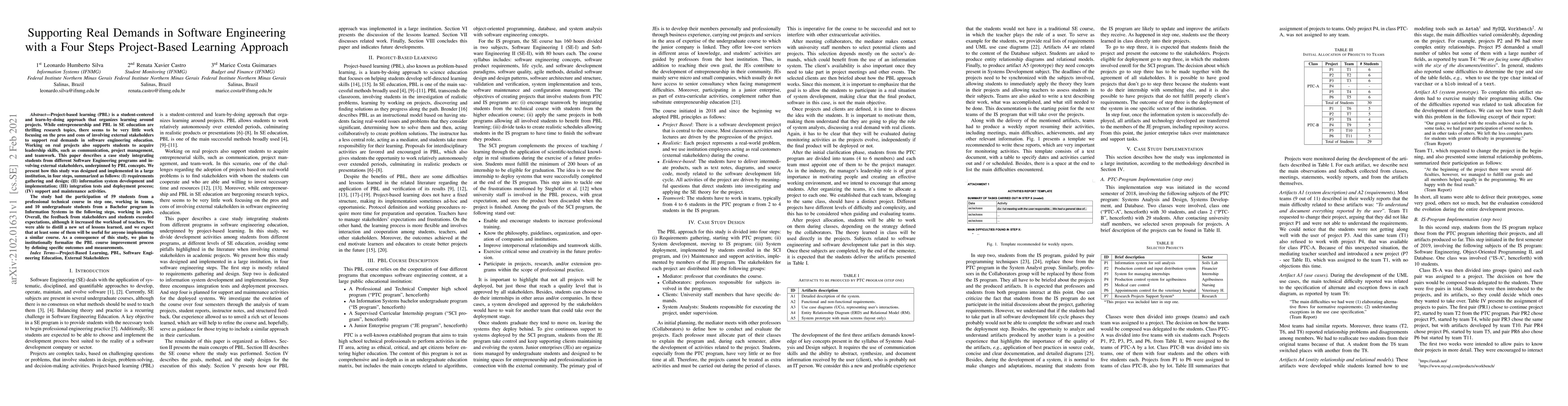 Project-based learning (PBL) is a student-centered and learn-by-doing approach that organizes learning around projects. While entrepreneurship and PBL in SE education are thrilling research topics, there seems to be very little work focusing on the pros and cons of involving external stakeholders to support real demands in software engineering education. Working on real projects also supports students to acquire leadership skills, such as communication, project management, and teamwork. This paper describes a case study integrating students from different Software Engineering programs and involving external stakeholders, underpinned by PBL concepts. We present how this study was designed and implemented in a large institution, in four steps, summarized as follows: (I) requirements gathering and design; (II) information system development and implementation; (III) integration tests and deployment process; (IV) support and maintenance activities. The study had the participation of 59 students from a professional technical course in step one, working in teams, and 10 undergraduate students from a Bachelor's program in Information Systems in the following steps, working in pairs. Overall, the feedback from stakeholders and students exceeded expectations, although it increased the workload of teachers. We were able to distill a new set of lessons learned, and we expect that at least some of them will be useful for anyone implementing a similar course. As a consequence of this study, we plan to institutionally formalize the PBL course improvement process by defining specific outcomes and measurements.