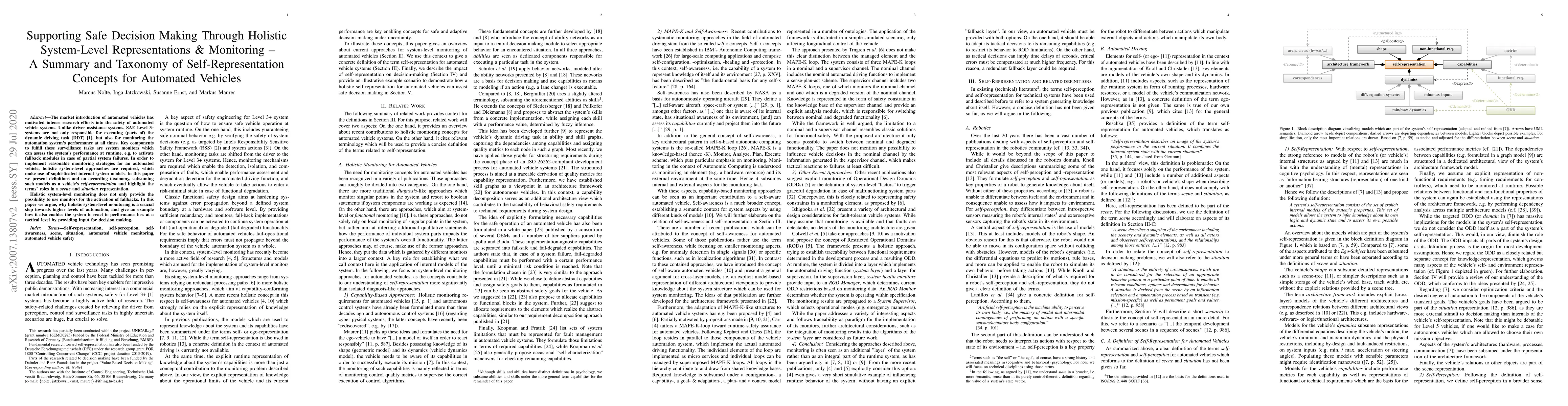 The market introduction of automated vehicles has motivated intense research efforts into the safety of automated vehicle systems. Unlike driver assistance systems, SAE Level 3+ systems are not only responsible for executing (parts of) the dynamic driving task (DDT), but also for monitoring the automation system's performance at all times. Key components to fulfill these surveillance tasks are system monitors which can assess the system's performance at runtime, e.g. to activate fallback modules in case of partial system failures. In order to implement reasonable monitoring strategies for an automated vehicle, holistic system-level approaches are required, which make use of sophisticated internal system models. In this paper we present definitions and an according taxonomy, subsuming such models as a vehicle's self-representation and highlight the terms' roles in a scene and situation representation. Holistic system-level monitoring does not only provide the possibility to use monitors for the activation of fallbacks. In this paper we argue, why holistic system-level monitoring is a crucial step towards higher levels of automation, and give an example how it also enables the system to react to performance loss at a tactical level by providing input for decision making.