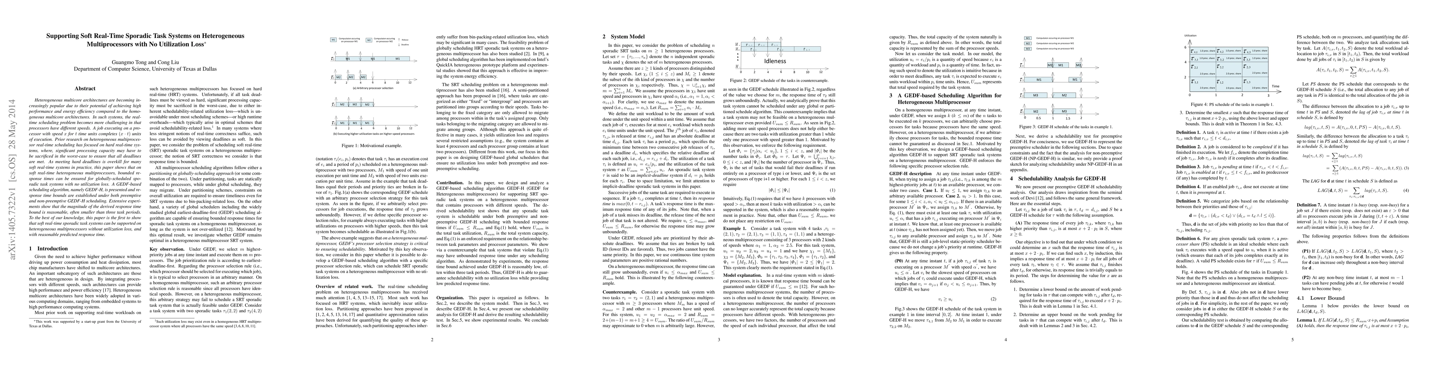 This paper proposes a GEDF-based scheduling algorithm, GEDF-H, to support soft real-time sporadic task systems on heterogeneous multiprocessors without utilization loss, ensuring bounded response times. Experimental results show that the derived response time bounds are often smaller than three task periods.