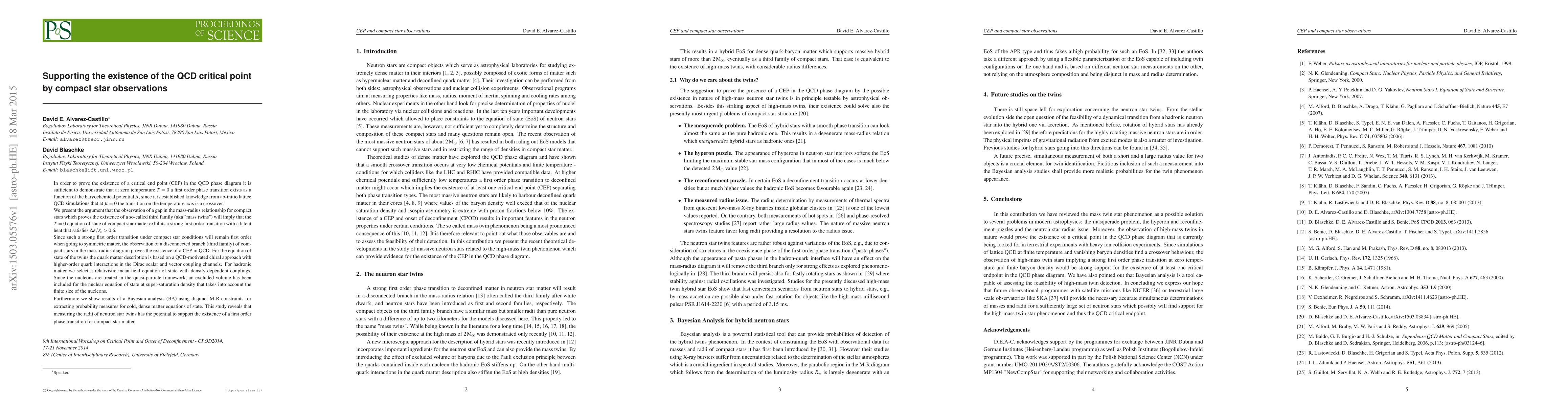 In order to prove the existence of a critical end point (CEP) in the QCD phase diagram it is sufficient to demonstrate that at zero temperature $T=0$ a first order phase transition exists as a function of the baryochemical potential $\mu$, since it is established knowledge from ab-initio lattice QCD simulations that at $\mu=0$ the transition on the temperature axis is a crossover. We present the argument that the observation of a gap in the mass-radius relationship for compact stars which proves the existence of a so-called third family (aka "mass twins") will imply that the $T=0$ equation of state of compact star matter exhibits a strong first order transition with a latent heat that satisfies $\Delta\epsilon/\epsilon_c \gt 0.6$. Since such a strong first order transition under compact star conditions will remain first order when going to symmetric matter, the observation of a disconnected branch (third family) of compact stars in the mass-radius diagram proves the existence of a CEP in QCD. For the equation of state of the twins the quark matter description is based on a QCD-motivated chiral approach with higher-order quark interactions in the Dirac scalar and vector coupling channels. For hadronic matter we select a relativistic mean-field equation of state with density-dependent couplings. Since the nucleons are treated in the quasi-particle framework, an excluded volume has been included for the nuclear equation of state at super-saturation density that takes into account the finite size of the nucleons. Furthermore we show results of a Bayesian analysis (BA) using disjunct M-R constraints for extracting probability measures for cold, dense matter equations of state. This study reveals that measuring the radii of neutron star twins has the potential to support the existence of a first order phase transition for compact star matter.