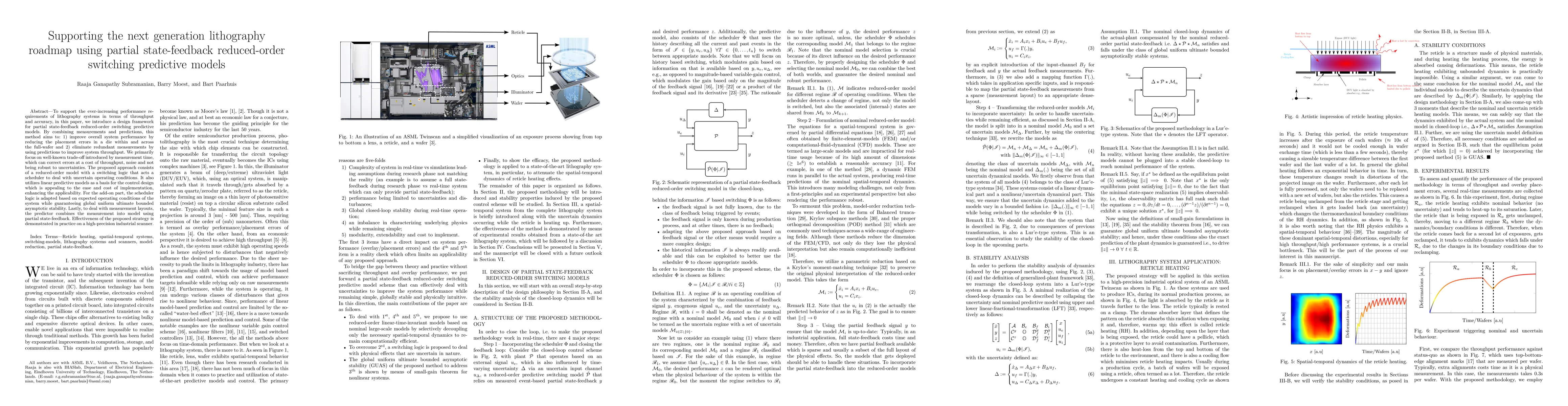 This paper proposes a design framework for partial state-feedback reduced-order switching predictive models to enhance lithography system performance, aiming to reduce placement errors and improve throughput by using predictions instead of redundant measurements. The approach combines reduced-order models with a switching scheduler and linear predictive models to balance performance and implementation cost.