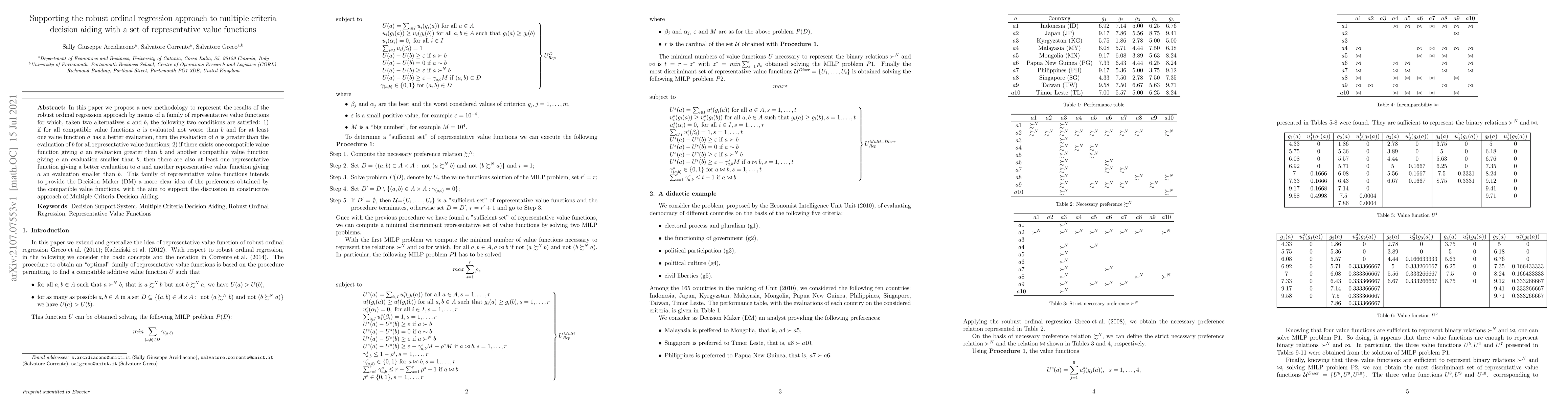 This paper proposes a new methodology for robust ordinal regression in multiple criteria decision aiding, using a family of representative value functions to clearly reflect the preferences derived from compatible value functions, aiding decision makers in understanding and discussing their preferences.