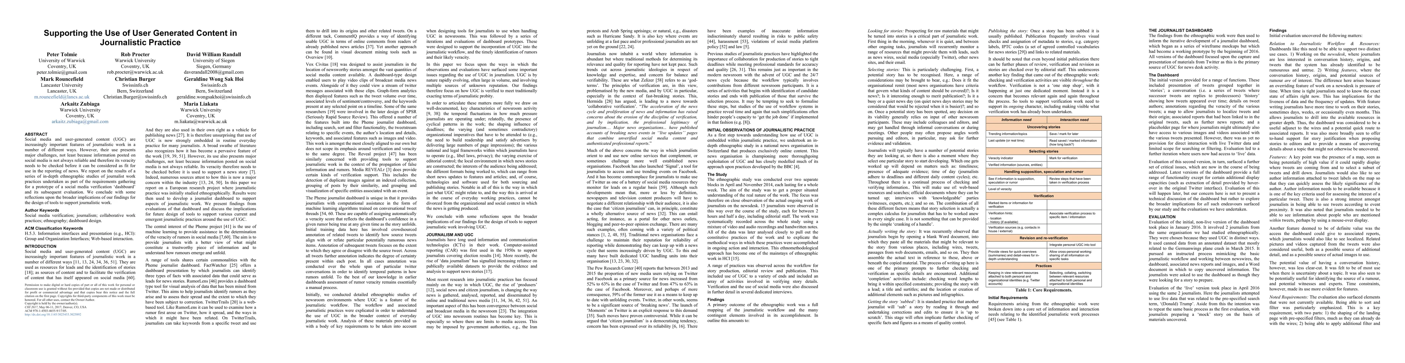Journalists face challenges verifying user-generated content on social media before using it in news reporting. A study of journalist work practices found that tools to support this process are needed to ensure reliable information.
