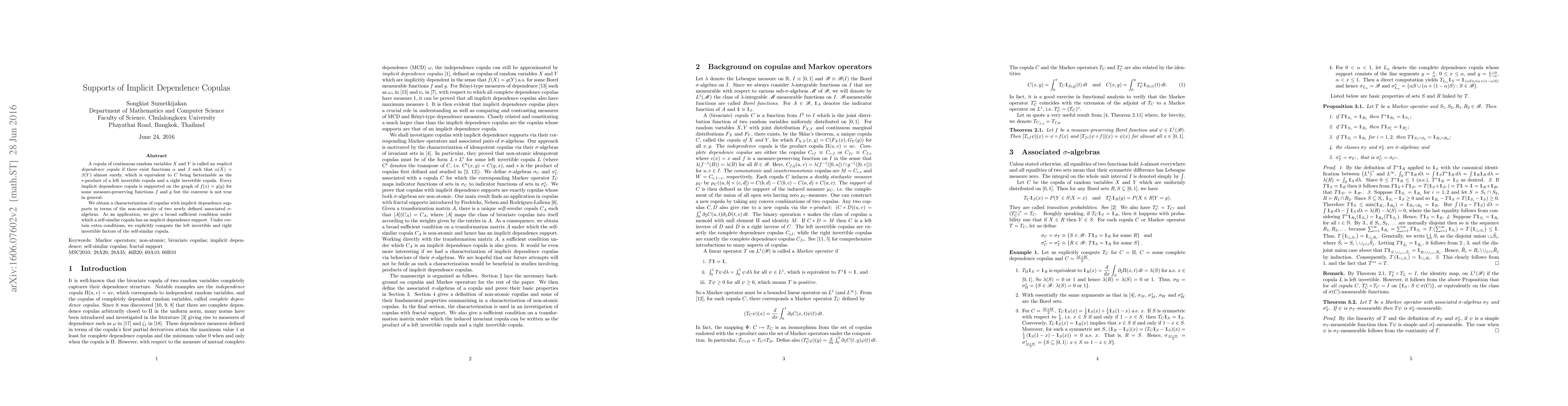 A copula of continuous random variables $X$ and $Y$ is called an \emph{implicit dependence copula} if there exist functions $\alpha$ and $\beta$ such that $\alpha(X) = \beta(Y)$ almost surely, which is equivalent to $C$ being factorizable as the $*$-product of a left invertible copula and a right invertible copula. Every implicit dependence copula is supported on the graph of $f(x) = g(y)$ for some measure-preserving functions $f$ and $g$ but the converse is not true in general. We obtain a characterization of copulas with implicit dependence supports in terms of the non-atomicity of two newly defined associated $\sigma$-algebras. As an application, we give a broad sufficient condition under which a self-similar copula has an implicit dependence support. Under certain extra conditions, we explicitly compute the left invertible and right invertible factors of the self-similar copula.